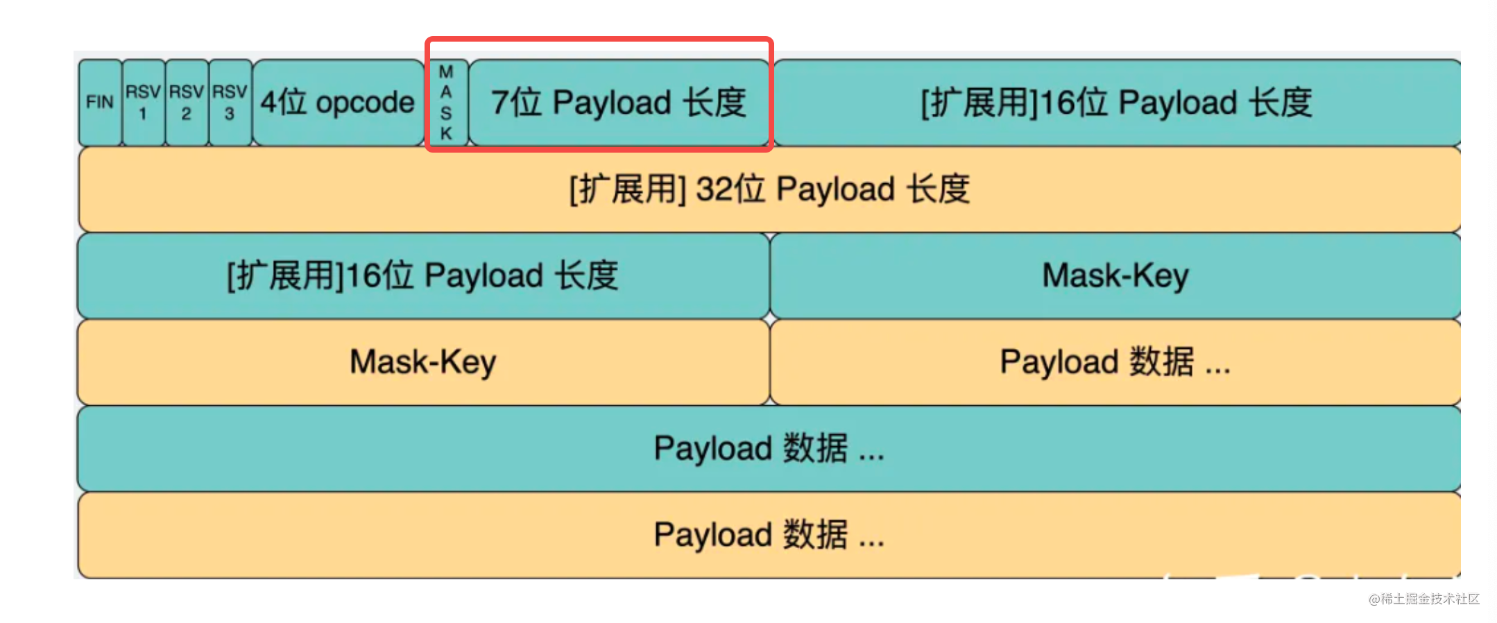 第二个字节存储了 mask(是否有加密),payload(数据长度)。