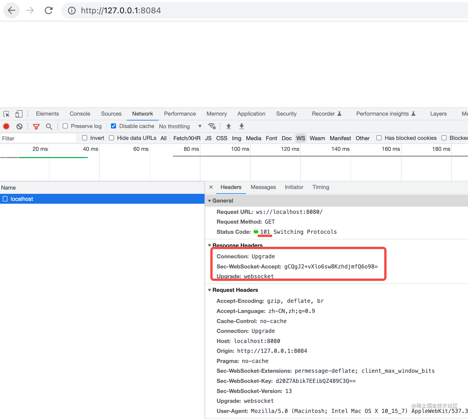 这个切换过程除了要带 upgrade 的 header 外,还要带 sec-websocket-key,服务端根据这个 key 算出结果,通过 sec-websocket-accept 返回。响应是 101 Switching Protocols 的状态码。