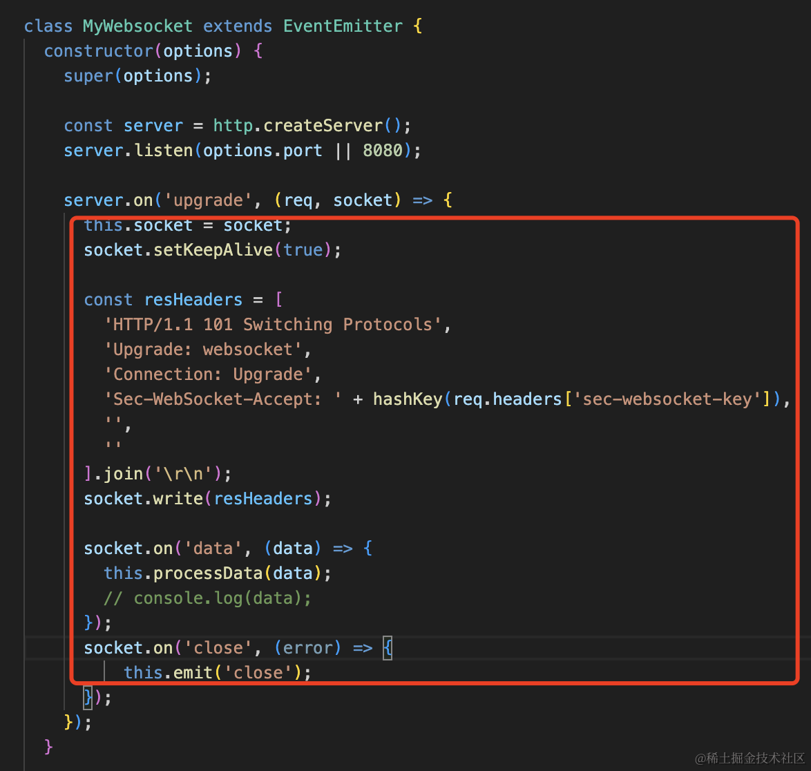 我们在构造函数里创建了一个 http 服务,当 ungrade 事件发生,也就是收到了 Connection: upgrade 的 header 的时候,返回切换协议的 header。