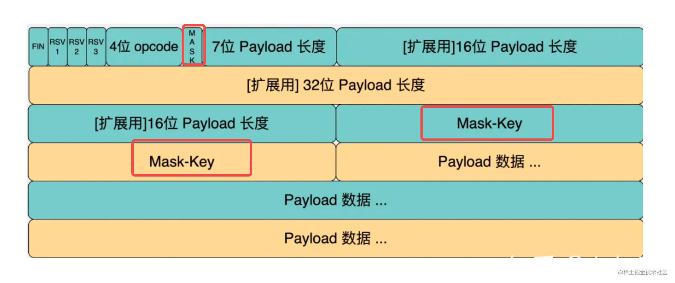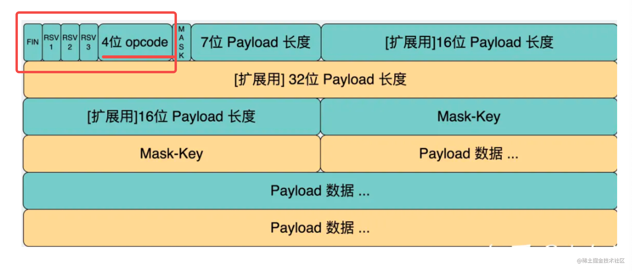 比如协议的第一个字节,就存储了 FIN(结束标志)、opcode(内容类型是 binary 还是 text) 等信息。