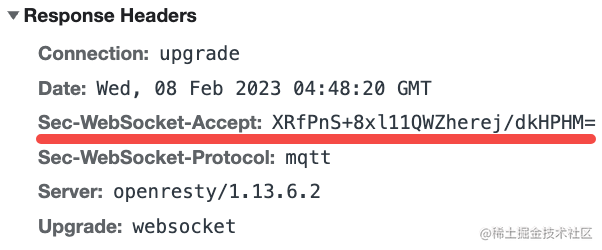 和请求 header 类似,Sec-WebSocket-Accept 是对请求带过来的 Sec-WebSocket-Key 处理之后的结果。