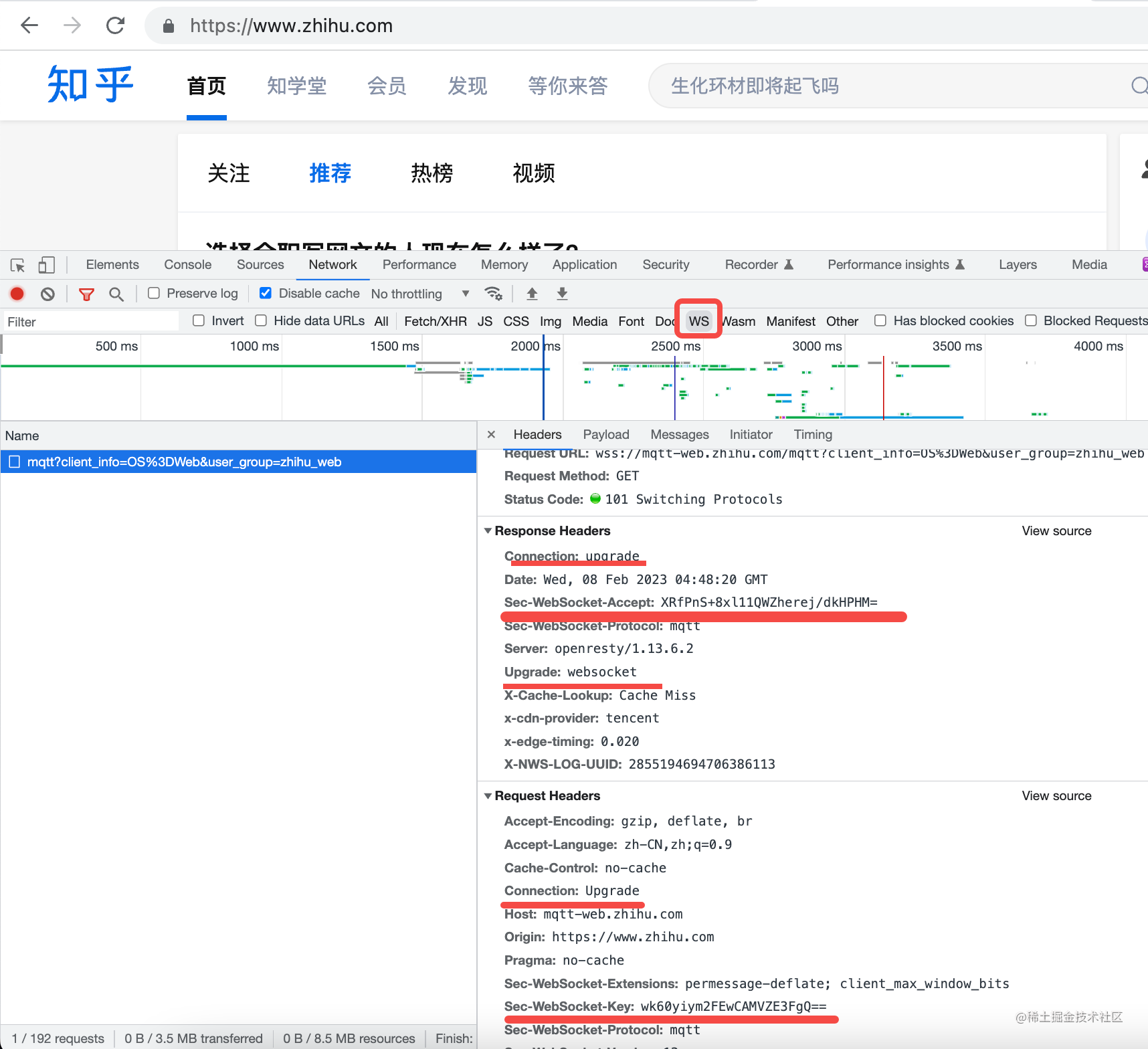 过滤出 ws 类型的请求,看看这几个 header,是不是就是前面说的那些。