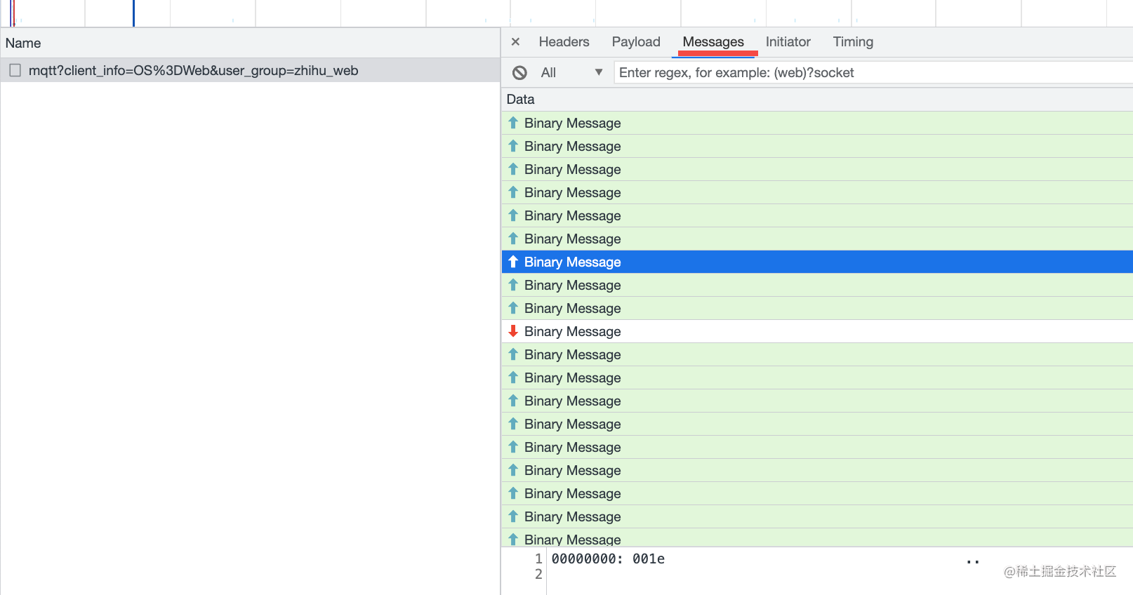 勾选 message 这一栏可以看到传输的消息,可以是文本、可以是二进制: