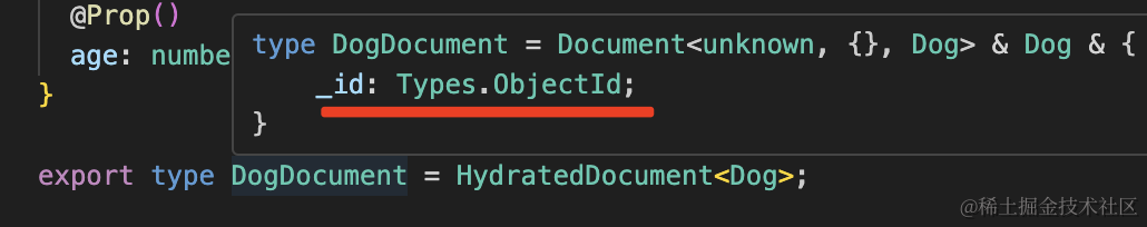 这个 HydratedDocument 只是在 Dog 类型的基础上加了一个 _id 属性: