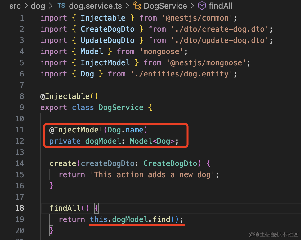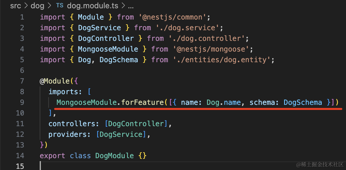 然后 dog.module.ts 里注入 Schema 对应的 Model