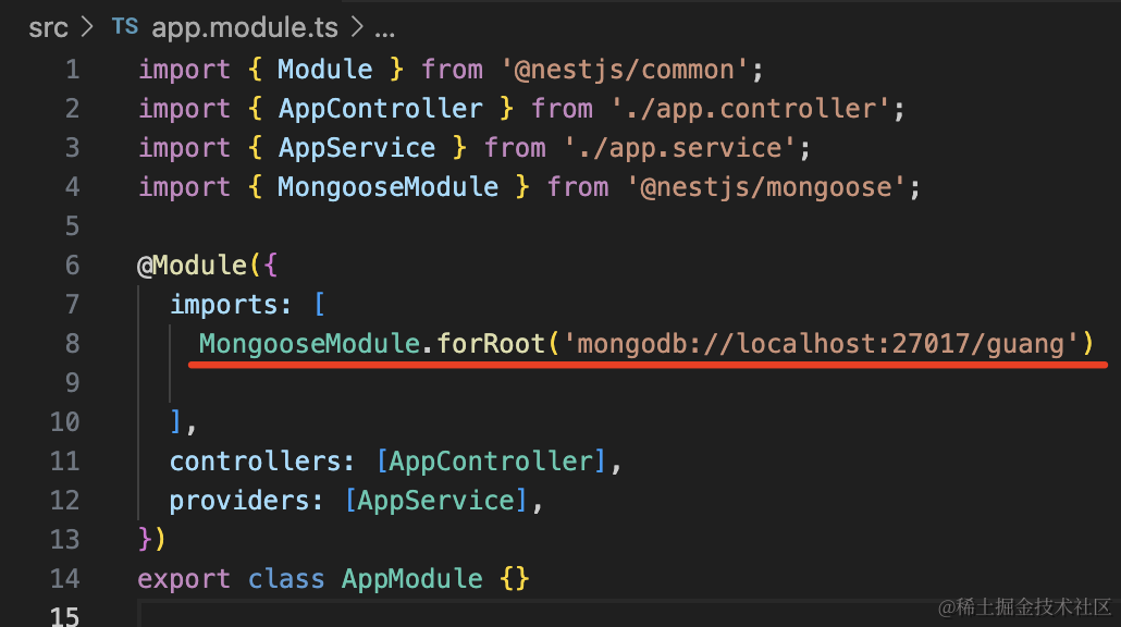 MongooseModule.forRoot('mongodb://localhost:27017/guang')