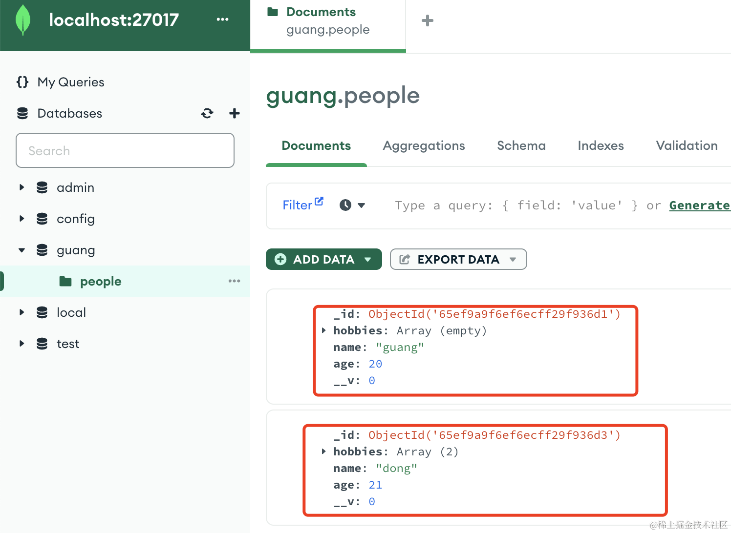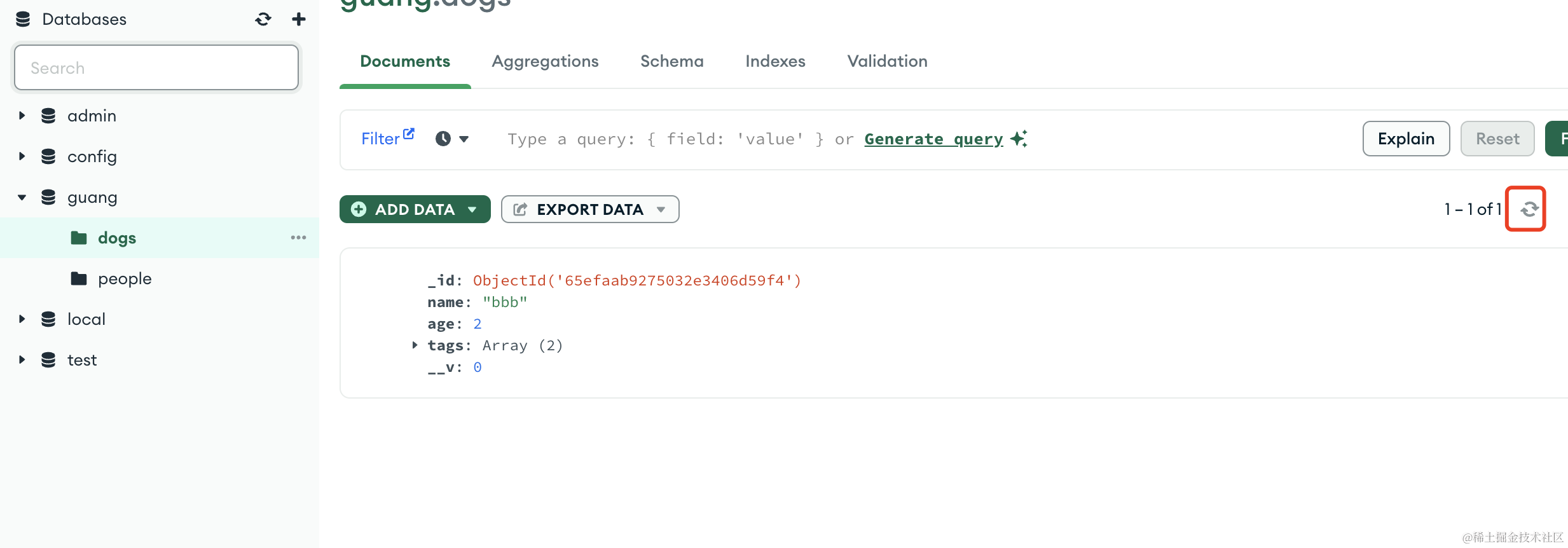 在 Mongodb Compass 里点击刷新,也可以看到数据确实被删掉了: