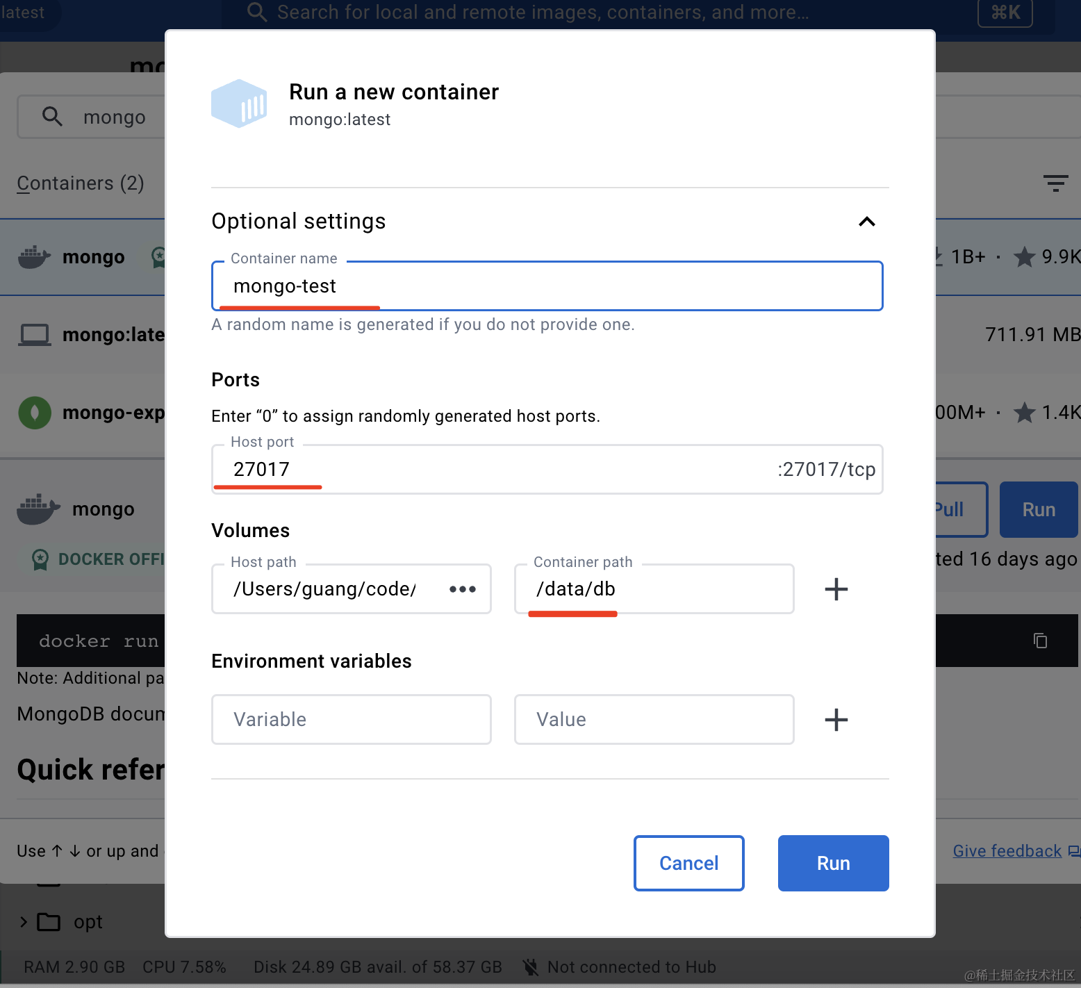 在 Docker Desktop 里把 mongodb 的容器跑起来: