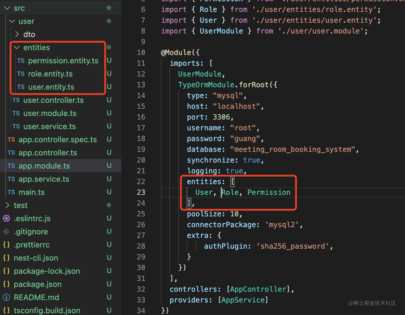 然后我们添加个 src/user/entities 目录,新建 3 个实体 User、Role、Permission。