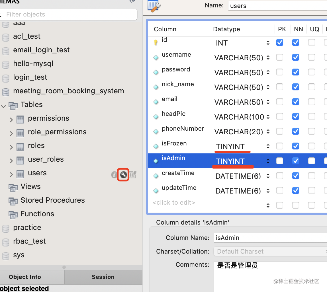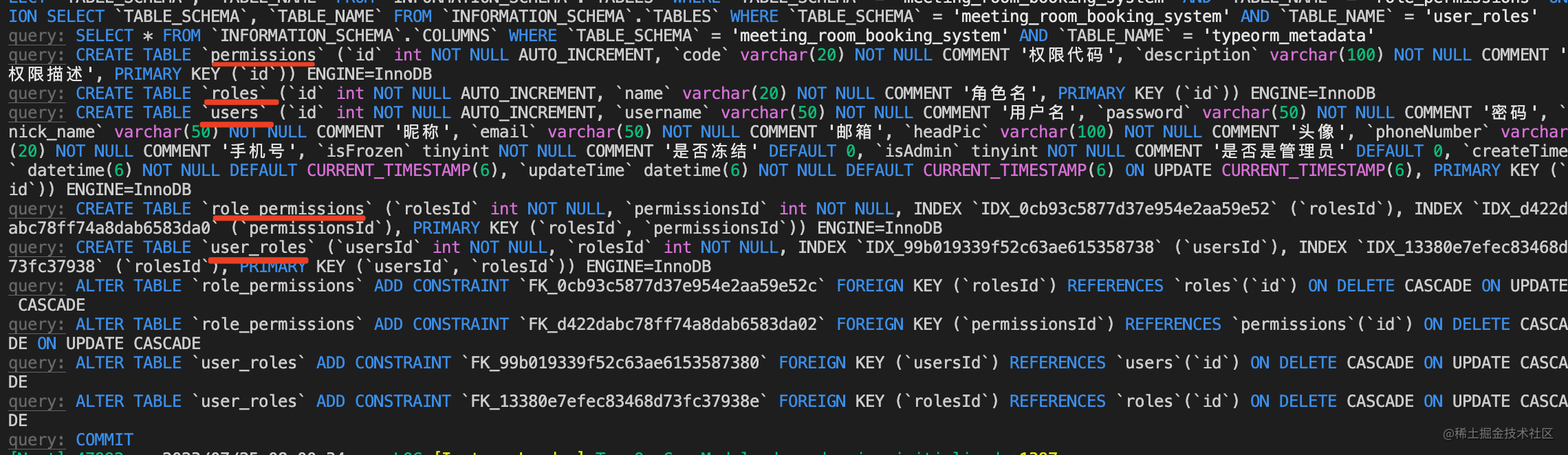创建了 User、Role、Permission 的 entity,通过 typeorm 的自动建表功能,在数据库创建了对应的 3 个表和 2 个中间表。