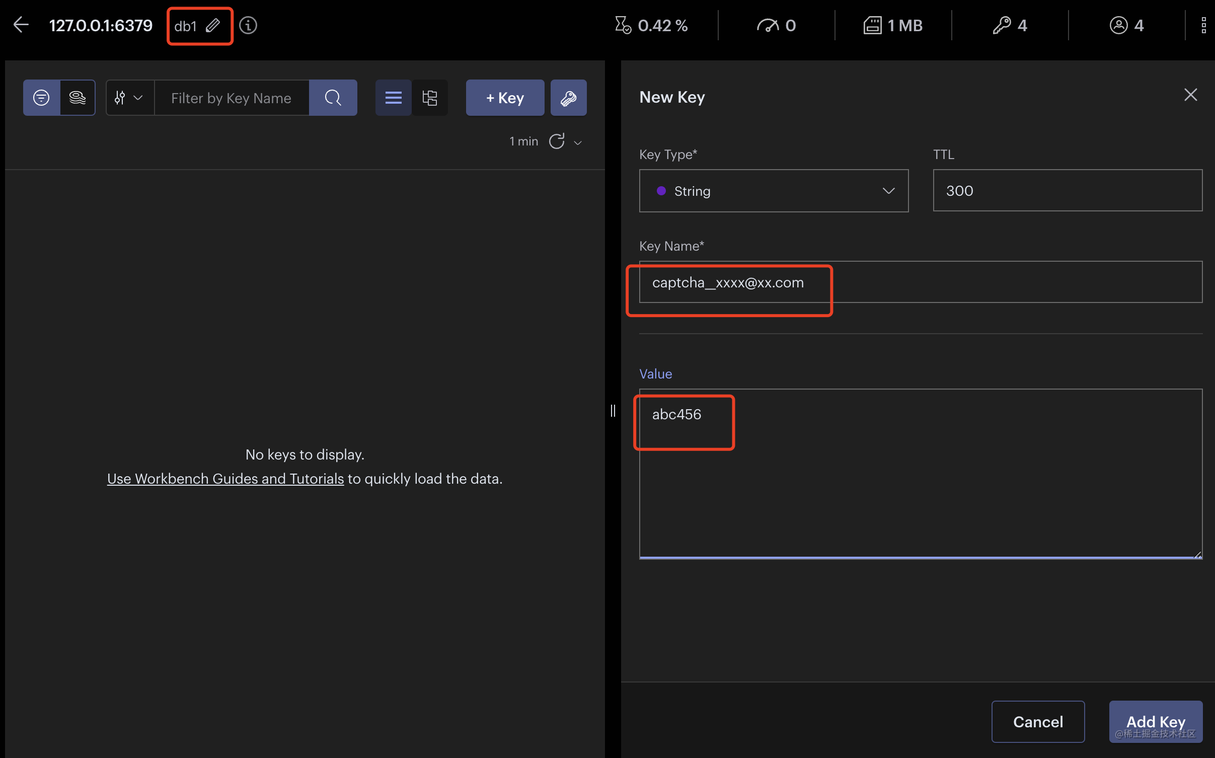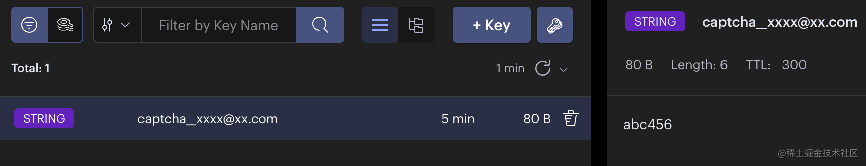 因为还没实现发送邮箱验证码的逻辑,这里我们手动在 redis 添加一个 key: