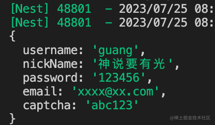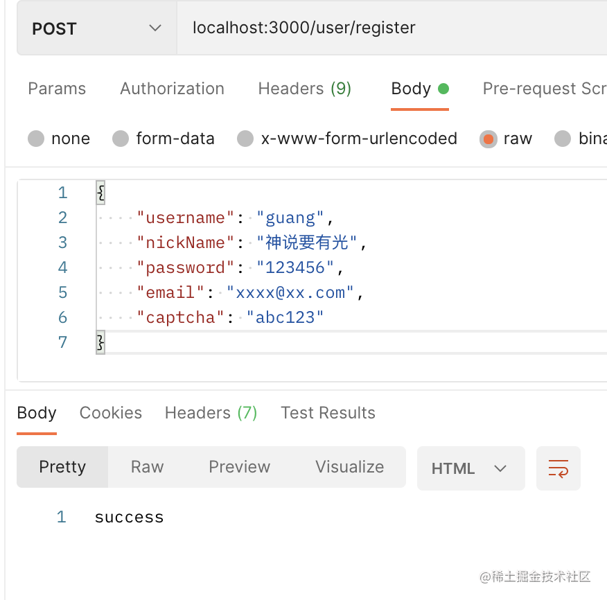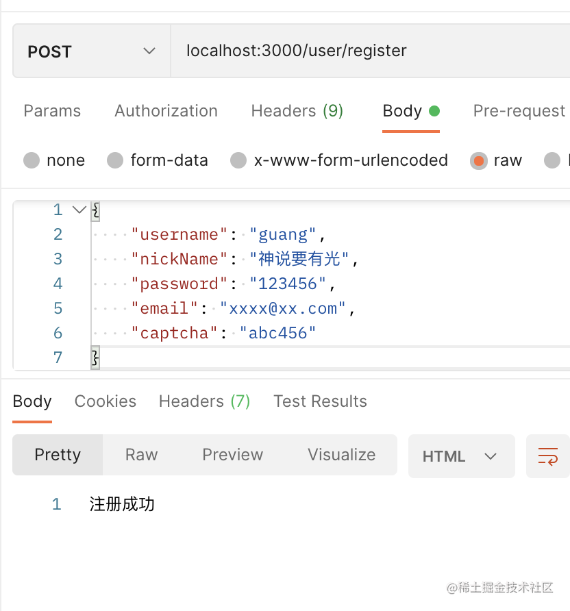 带上正确的验证码,返回注册成功: