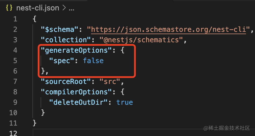 先在 nest-cli.json 里添加 generateOptions,设置 spec 为 false