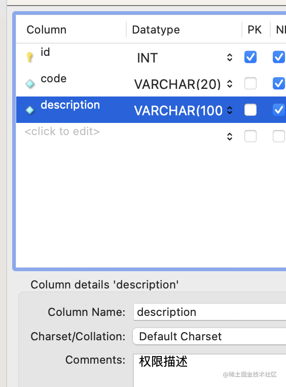 | description | VARCHAR(100) | 权限描述 |