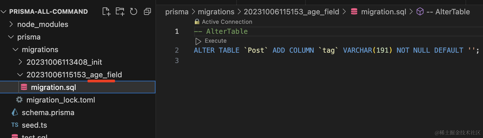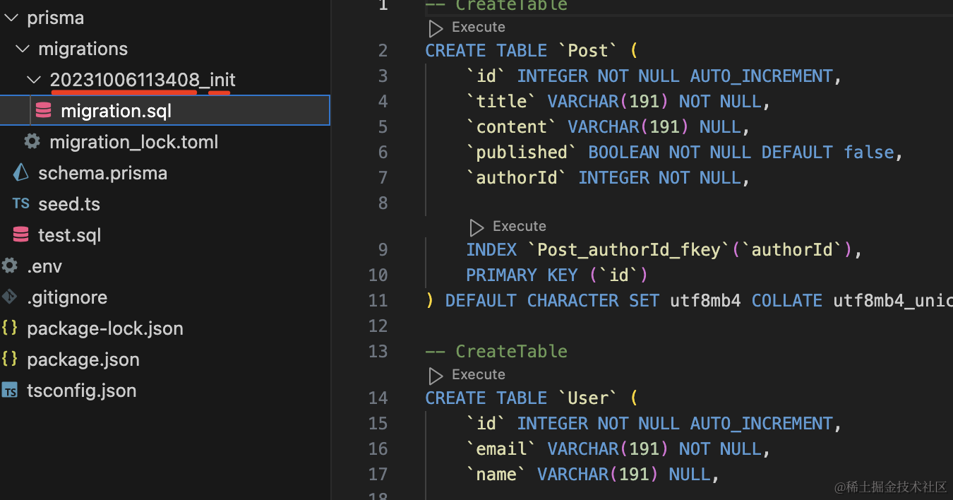 在 prisma/migrations 下会保存这次 migration 的 sql 文件。
