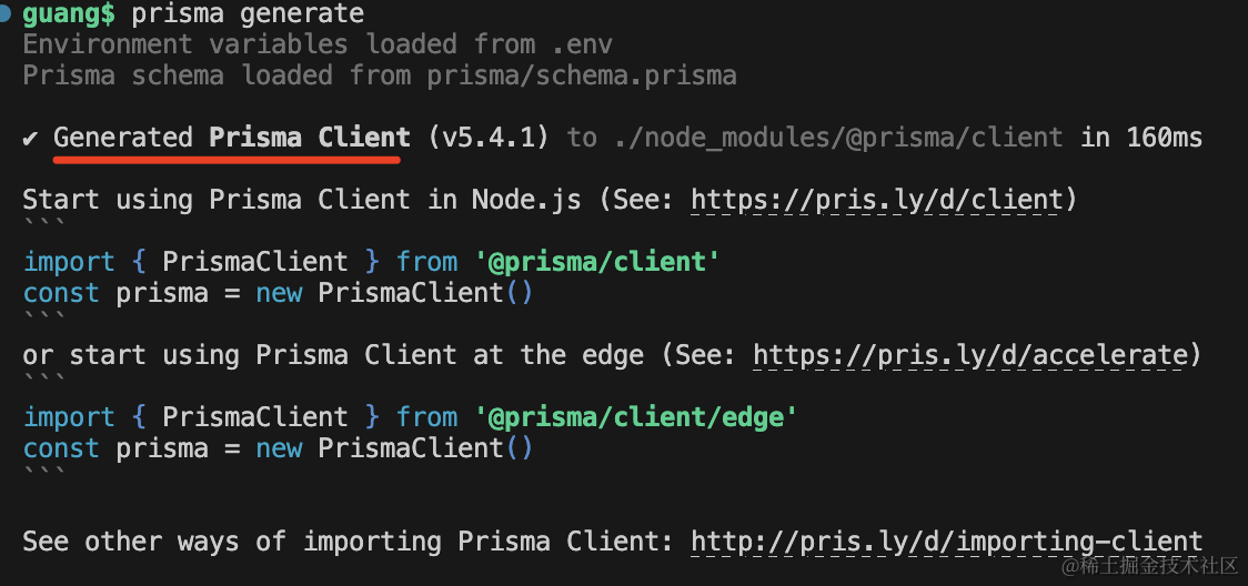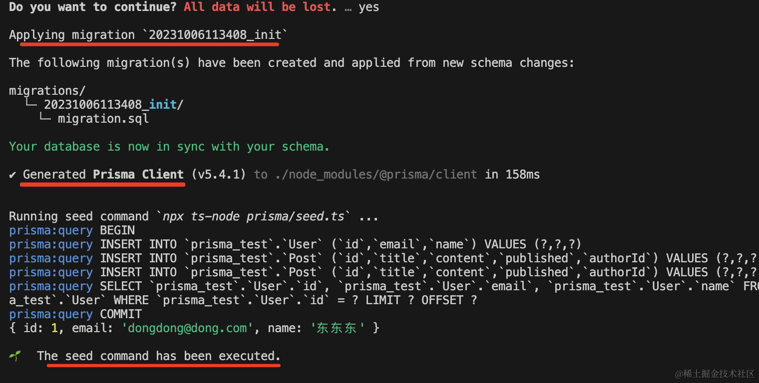 还会生成 client 代码,并且执行 prisma db seed 来初始化数据。