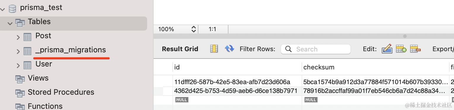 在数据库中有个 _prisma_migrations 表,记录着数据库 migration 的历史: