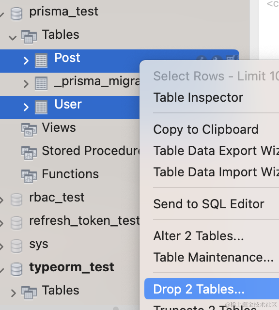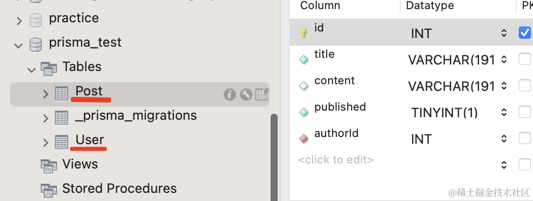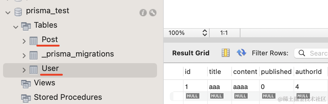 现在连接的 prisma_test 数据库里是有这两个表的:
