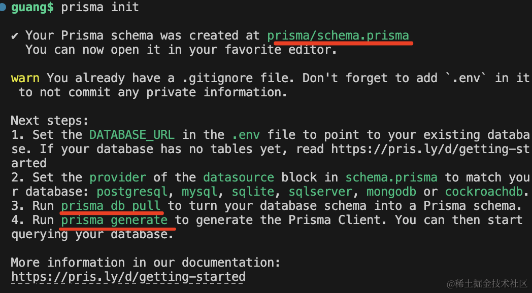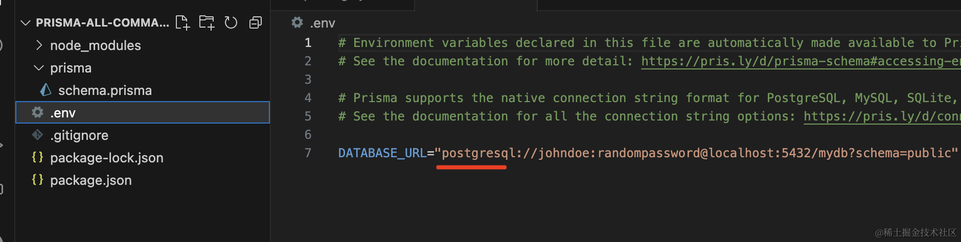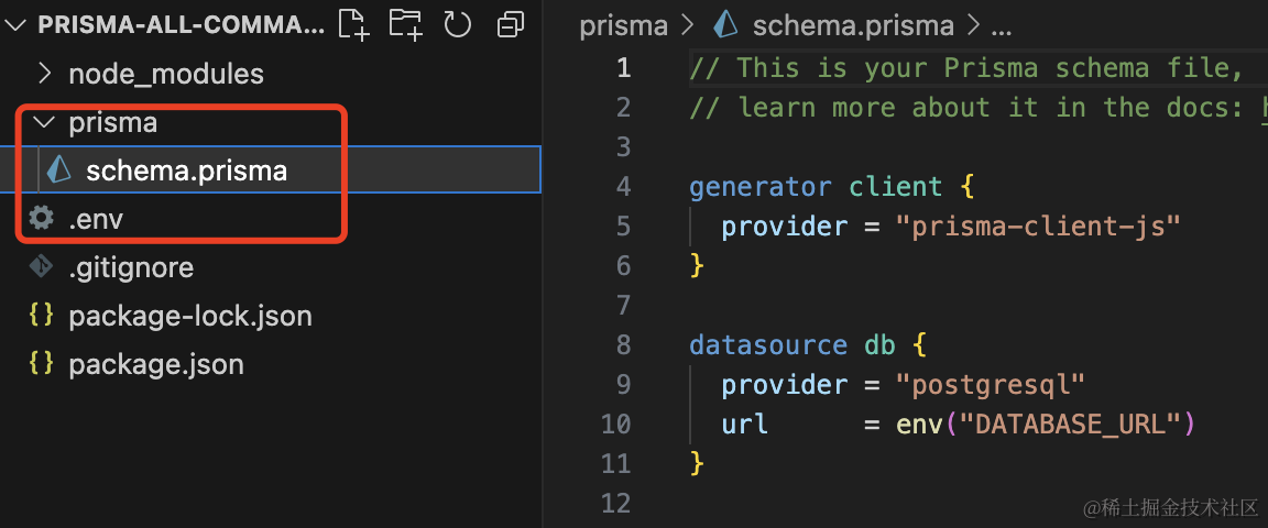 执行 init 命令后生成了 prisma/shcema.prisma 和 .env 文件: