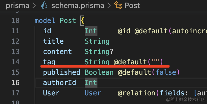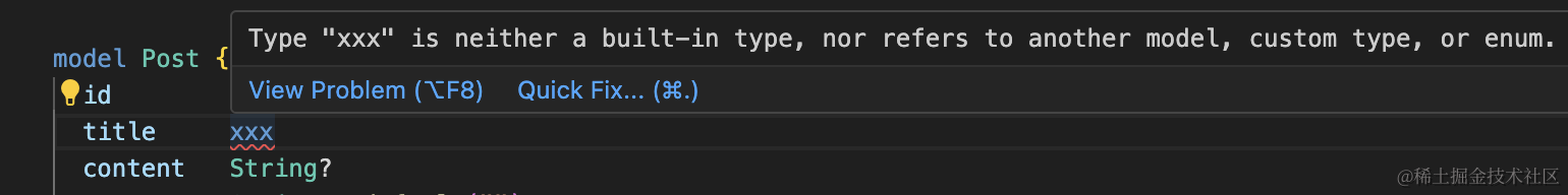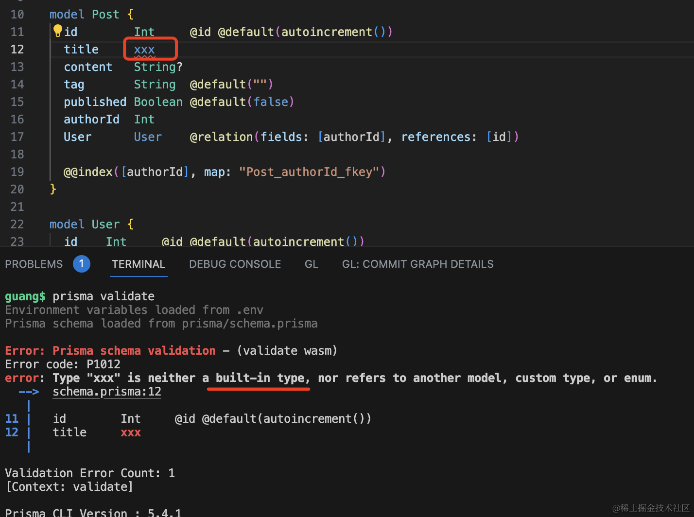 当然,我们安装了 prisma 的插件之后,可以直接在编辑器里看到这个错误: