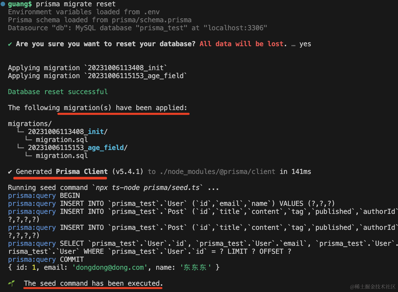 并且会生成 client 代码,而且会自动执行 prisma db seed,插入初始化数据。