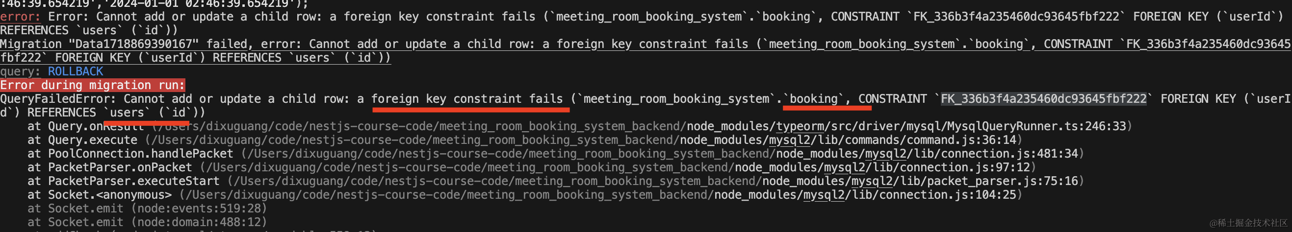 就是你插入了一条 booking 记录,里面的 userId 在 user 表里没关联的 user。