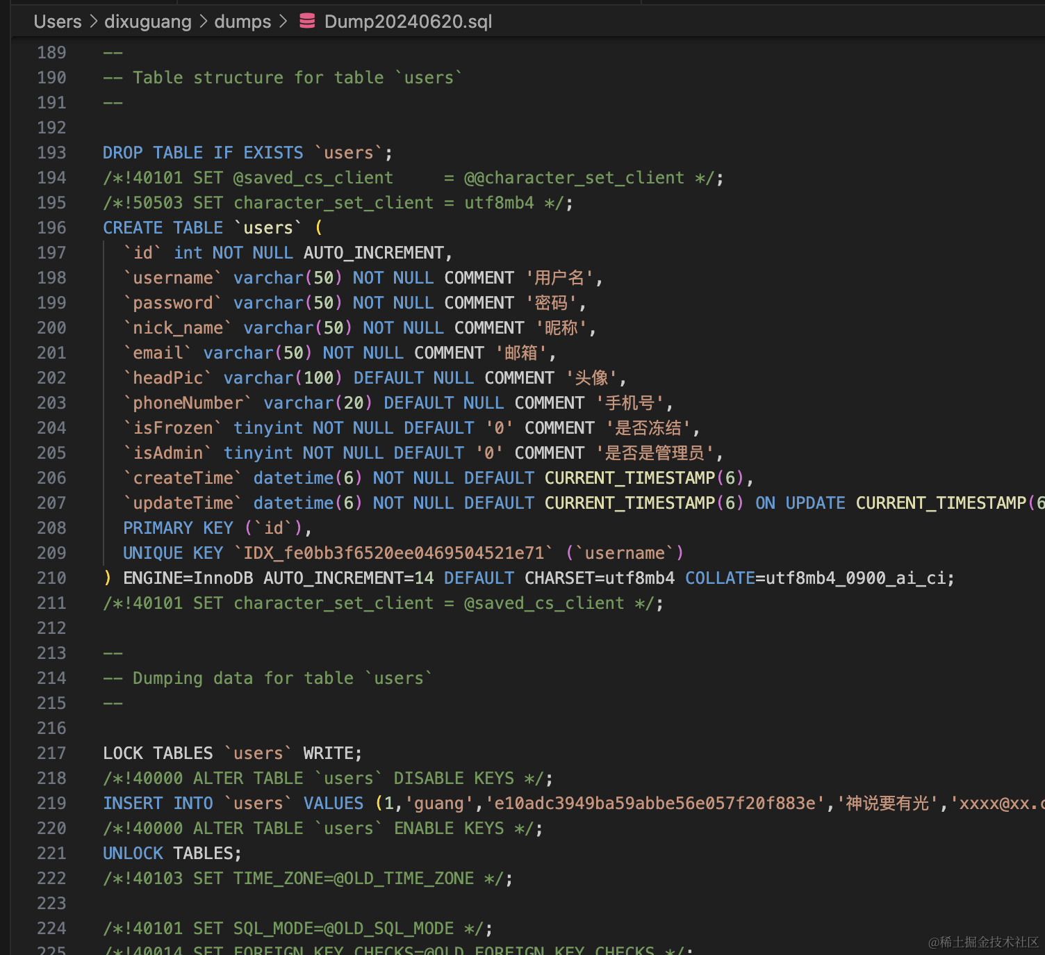 await queryRunner.query("INSERT INTO `users` VALUES (1,'guang','e10adc3949ba59abbe56e057f20f883e','神说要有光','xxxx@xx.com',NULL,NULL,1,0,'2023-07-25 02:25:03.379725','2023-09-12 03:40:40.000000'),(2,'guang2','e10adc3949ba59abbe56e057f20f883e','神说要有光2','1024195375@qq.com',NULL,NULL,1,0,'2023-07-26 01:39:33.456072','2023-09-12 03:57:06.000000'),(8,'zhangsan','e3ceb5881a0a1fdaad01296d7554868d','张三','1024195375@qq.com','uploads/1694845395657-974488092-headpic1.png','13233323333',1,1,'2023-07-26 03:19:06.523236','2023-09-16 06:59:32.000000'),(9,'lisi','1a100d2c0dab19c4430e7d73762b3423','里斯','yy@yy.com','xxx.png',NULL,1,0,'2023-07-26 03:19:06.553169','2023-08-02 13:05:53.000000'),(10,'dongdong','1a100d2c0dab19c4430e7d73762b3423','东东555','1024195375@qq.com','uploads/1692775078275-227950493-headpic2.png',NULL,1,0,'2023-08-12 15:41:10.537642','2023-09-12 04:01:41.000000'),(11,'gang','96e79218965eb72c92a549dd5a330112','小刚','1024195375@qq.com',NULL,NULL,1,0,'2023-08-12 23:54:38.856096','2023-09-12 03:50:45.000000'),(12,'xiaohong','96e79218965eb72c92a549dd5a330112','小红','1024195375@qq.com',NULL,NULL,0,0,'2023-08-13 00:00:53.802850','2023-09-12 03:54:32.846920'),(13,'xiaodong','96e79218965eb72c92a549dd5a330112','东东','1024195375@qq.com',NULL,NULL,1,0,'2023-08-13 00:01:52.641836','2023-09-12 03:53:09.000000');")