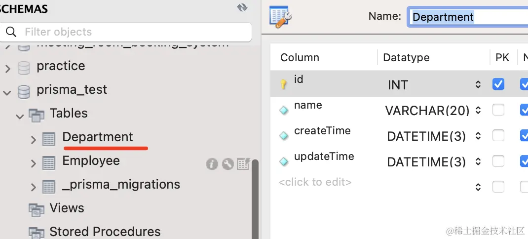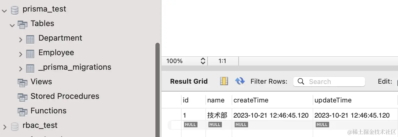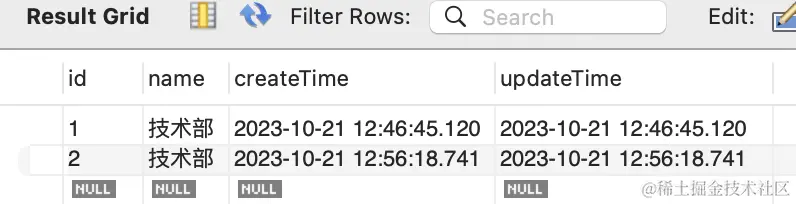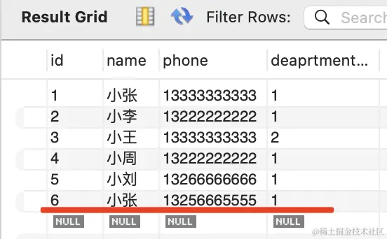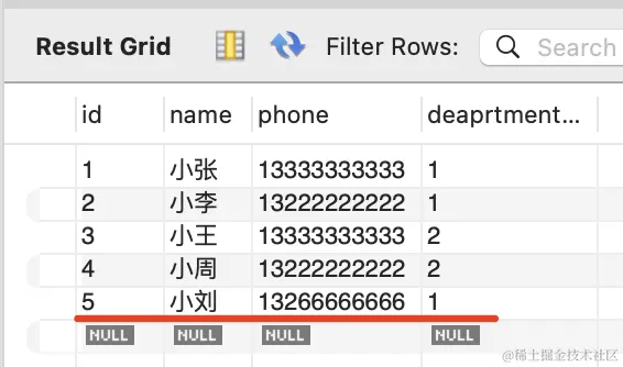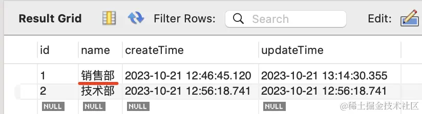 在 mysql workbench 里可以看到,id 为 1 的 department 更新了: