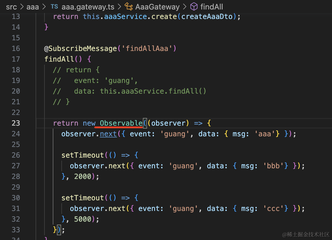 如果想异步返回消息,就通过 rxjs 的 Observer 来异步多次返回。