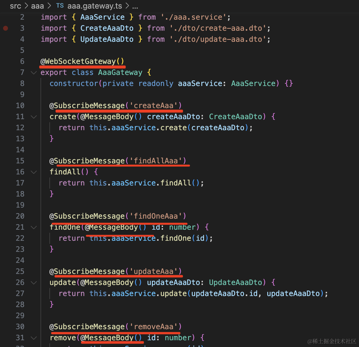 @WebSocketGateWay 声明这是一个处理 weboscket 的类。