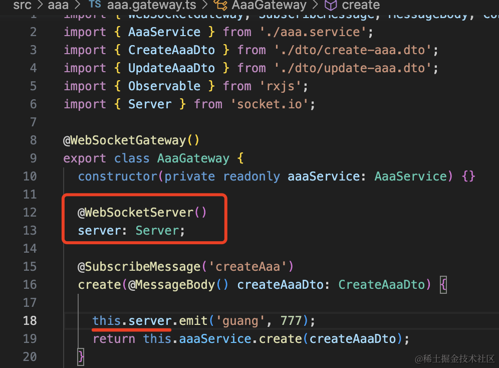 除了 @ConnectedSocket 装饰器注入实例,也可以用 @WebSocketServer 注入实例: