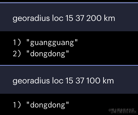 # 然后用 georadius 分别查找经度 15、纬度 37 位置的附近 100km 半径和 200km 半径的点: