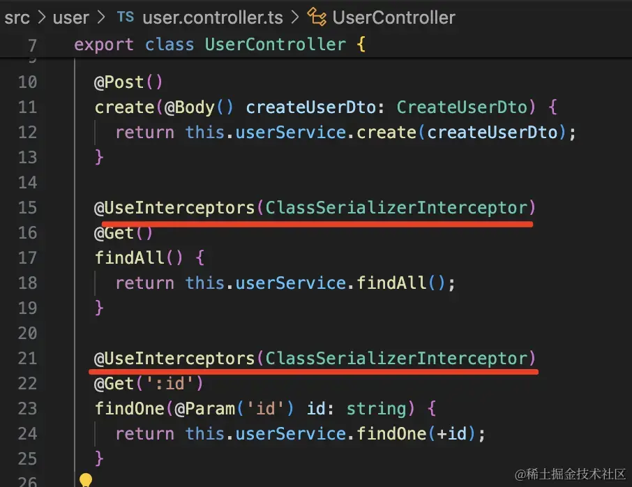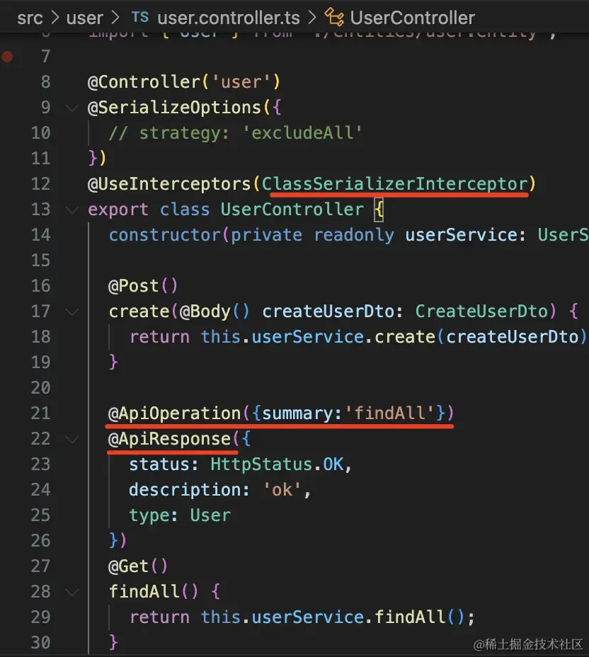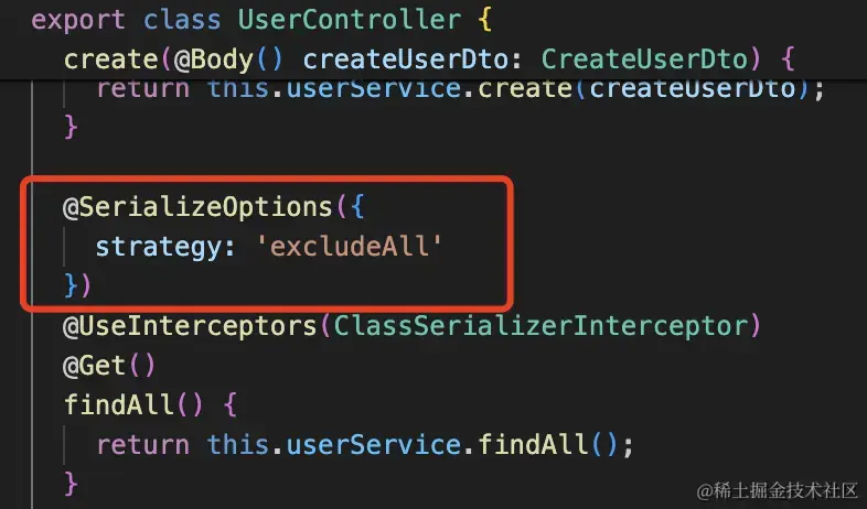 然后在 cotnroller 上加上 ClassSerializerInterceptor 的 interceptor,还可以用 @SerializeOptions 来添加 options。