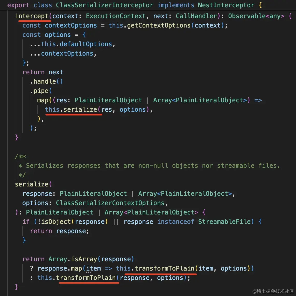 它的底层是基于 class-transfomer 包来实现的,拿到响应对象,plainToClass 拿到 class,然后根据 class 的装饰器再 classToPlain 创建序列化的对象。