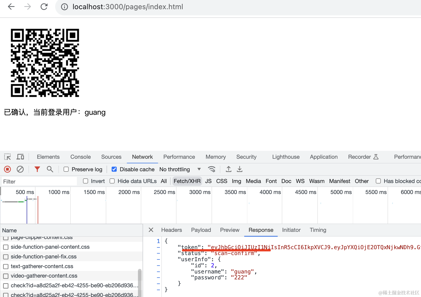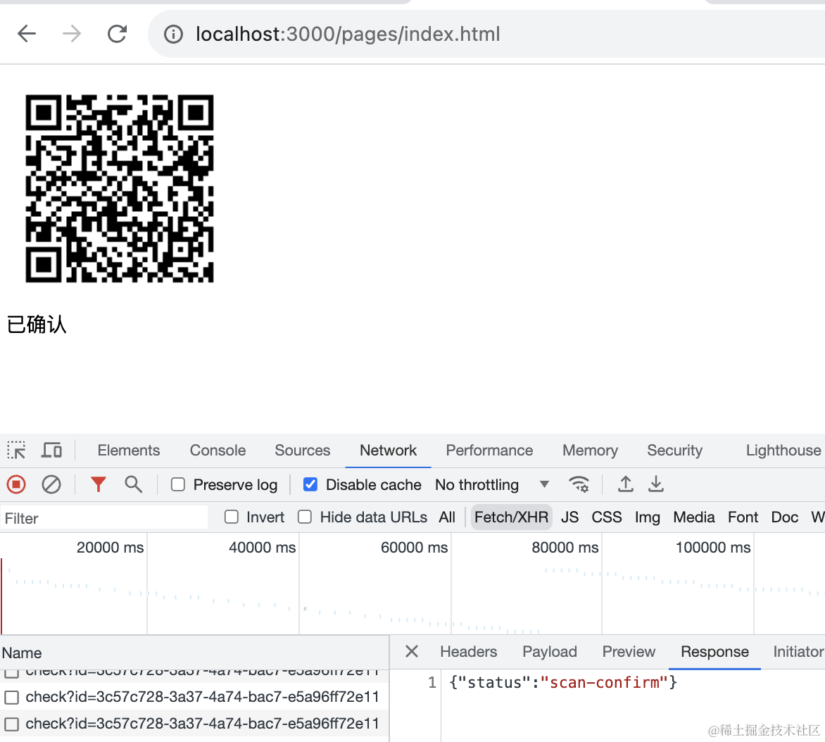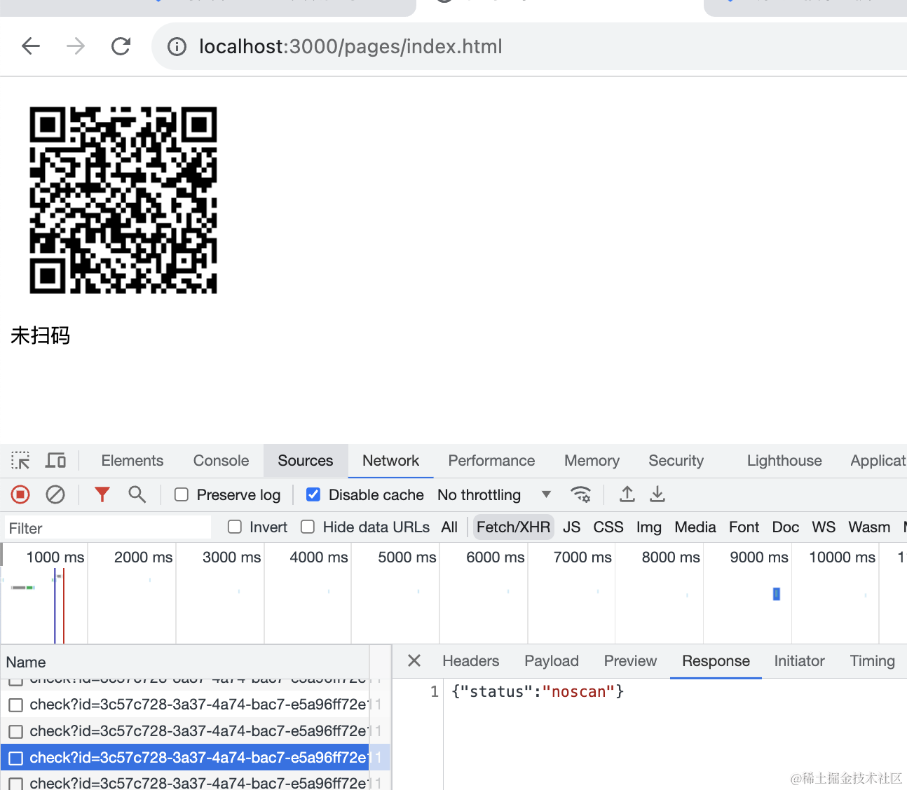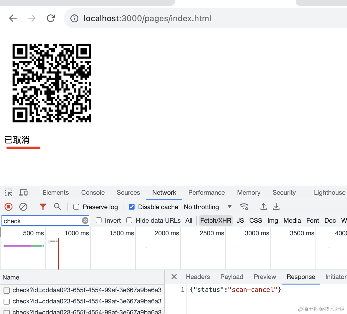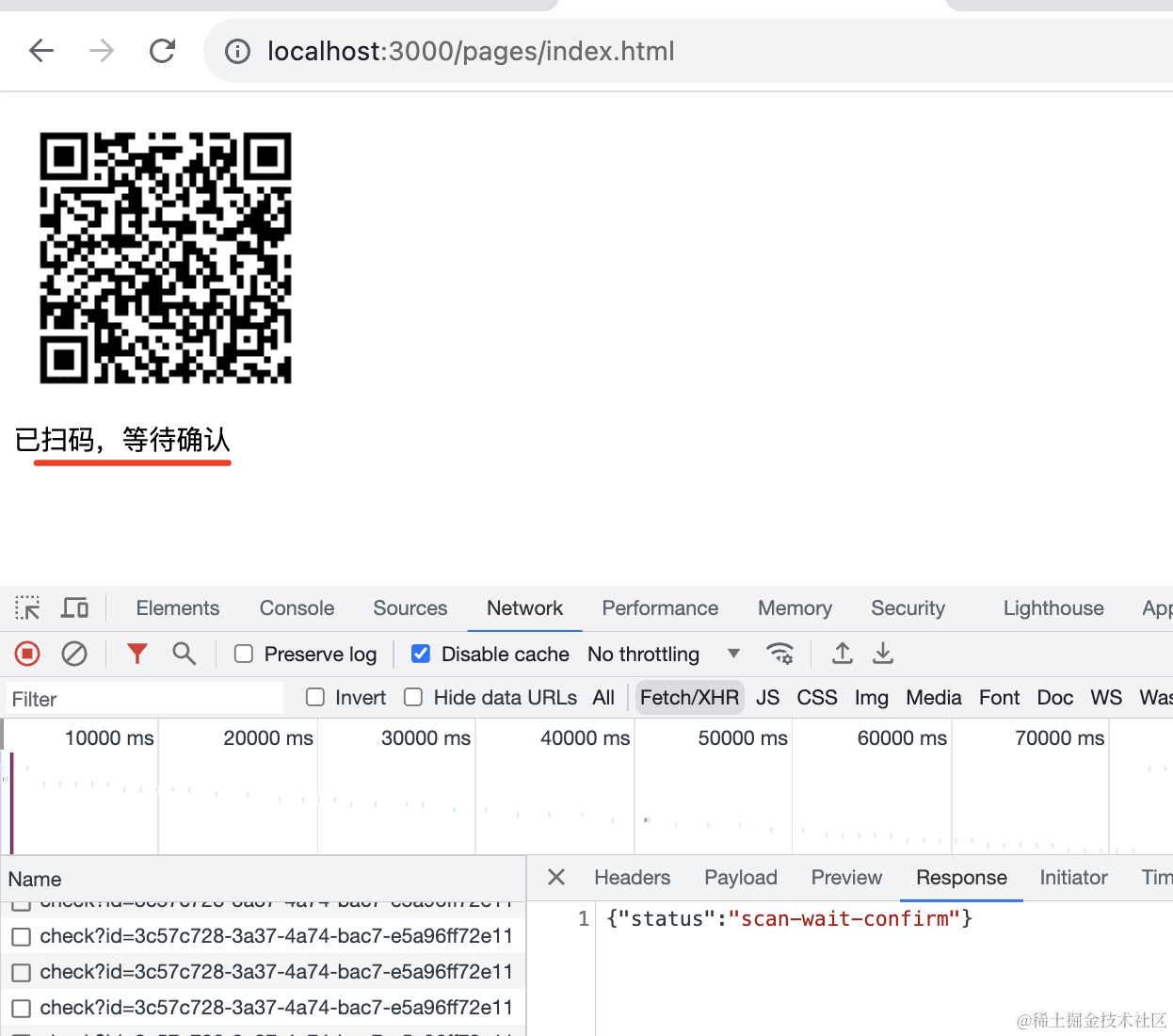 还有个 qrcode/check 接口,会返回 redis 里的二维码状态,浏览器里可以轮询这个接口拿到二维码状态。