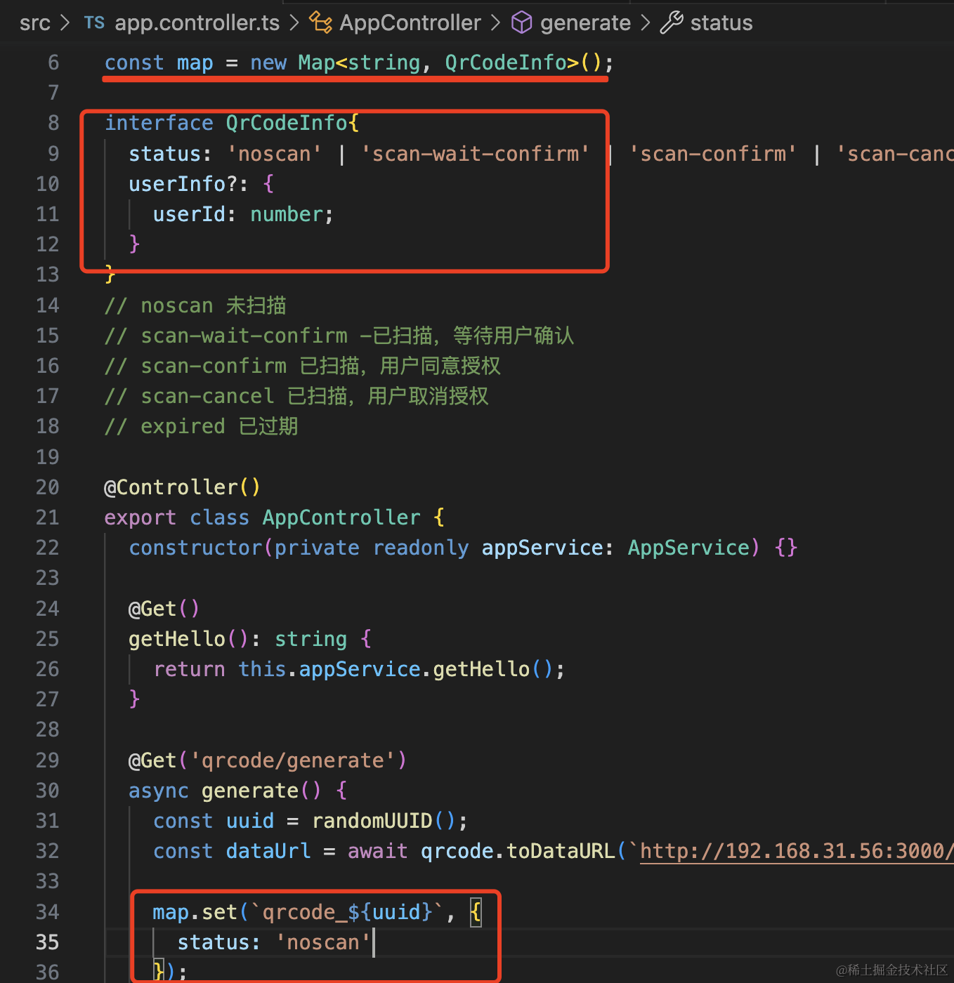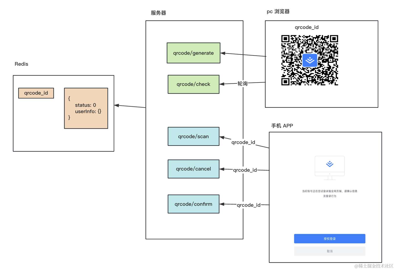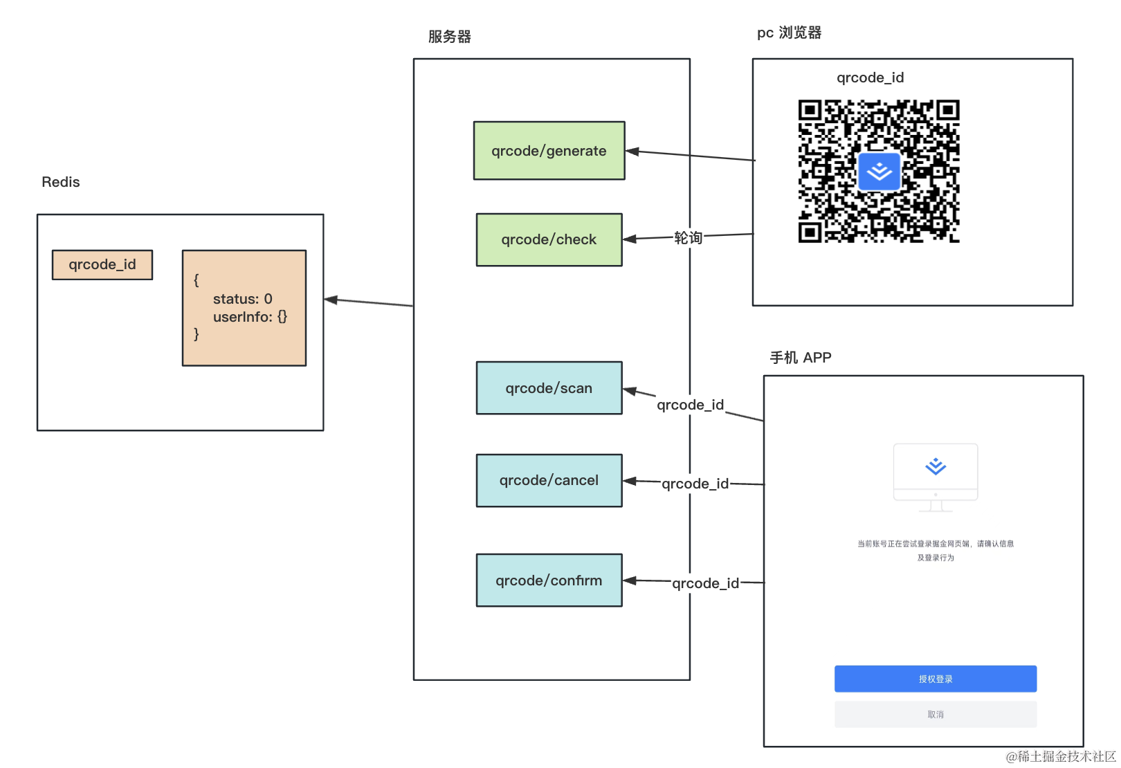 在 redis 里保存着二维码的状态和用户信息,然后这边确认之后,另一边就可以用 userInfo 生成 jwt 的 token,从而实现登录。
