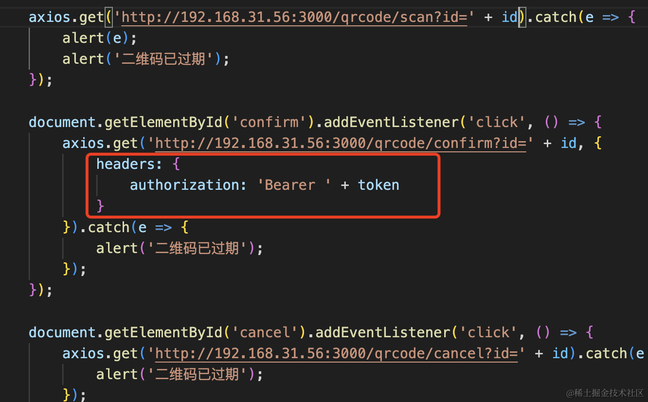 axios.get('http://192.168.31.56:3000/qrcode/confirm?id=' + id, {