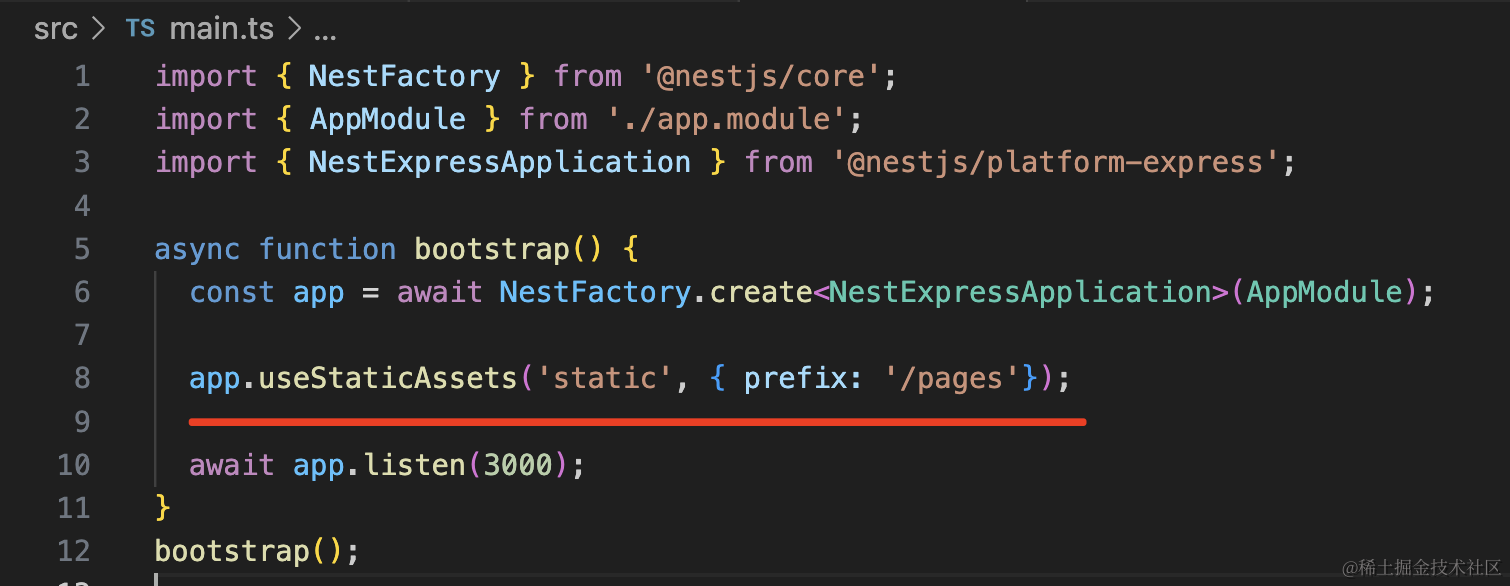 然后在 main.ts 里支持这个目录下静态资源的访问,用 pages 作为前缀: