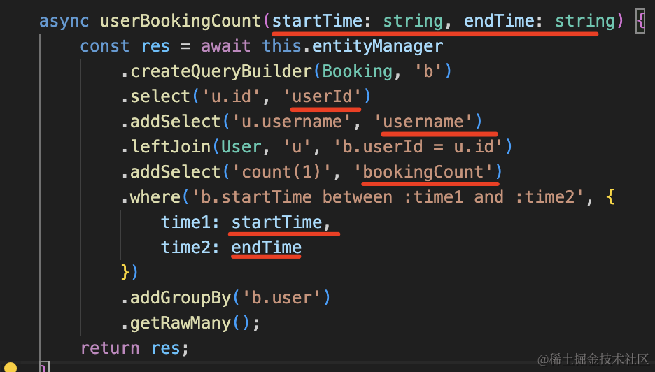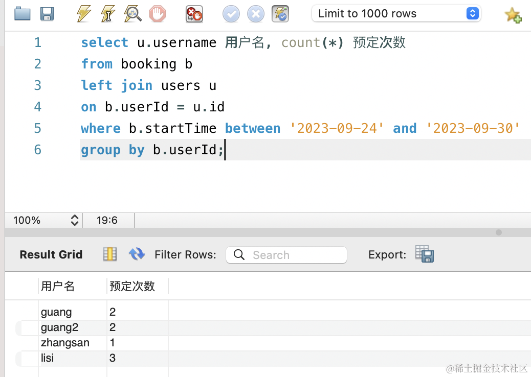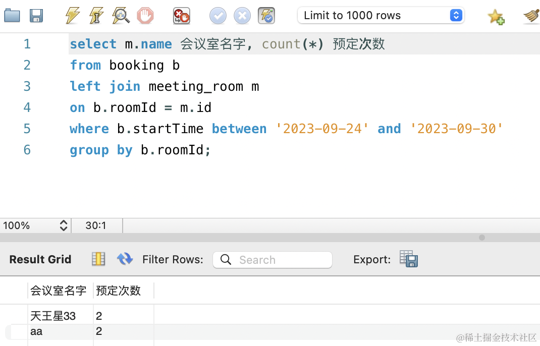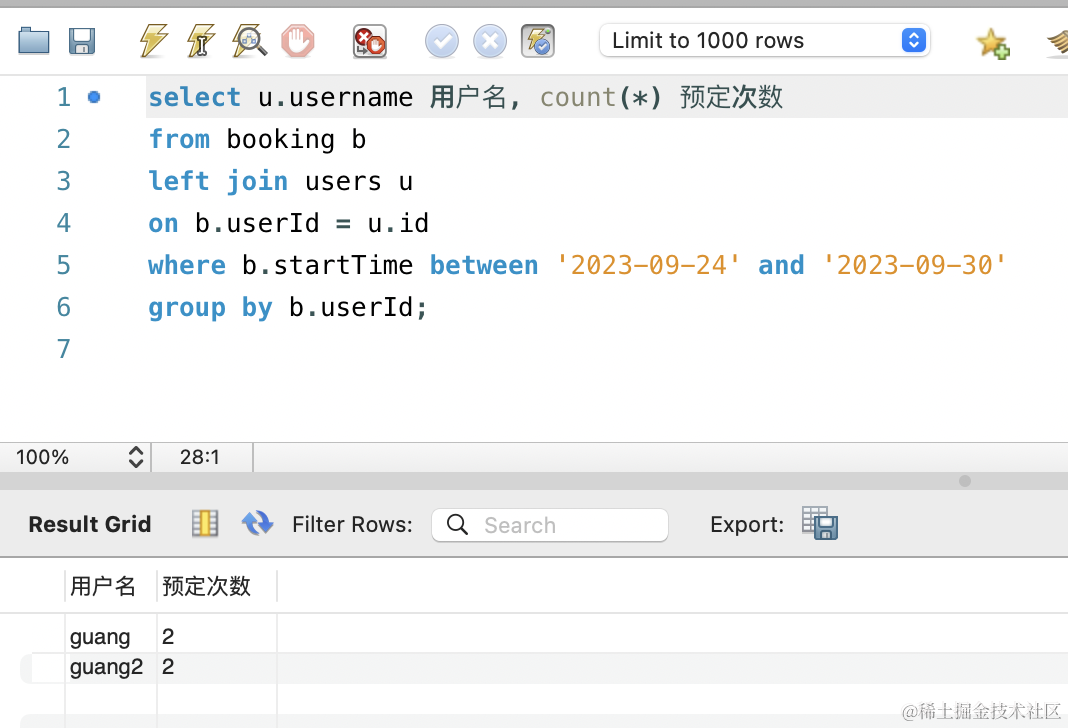 就两个统计 sql,我们先在 mysql workbench 里写了这个统计 sql,然后在 typeorm 里用 query builder 的方式实现。