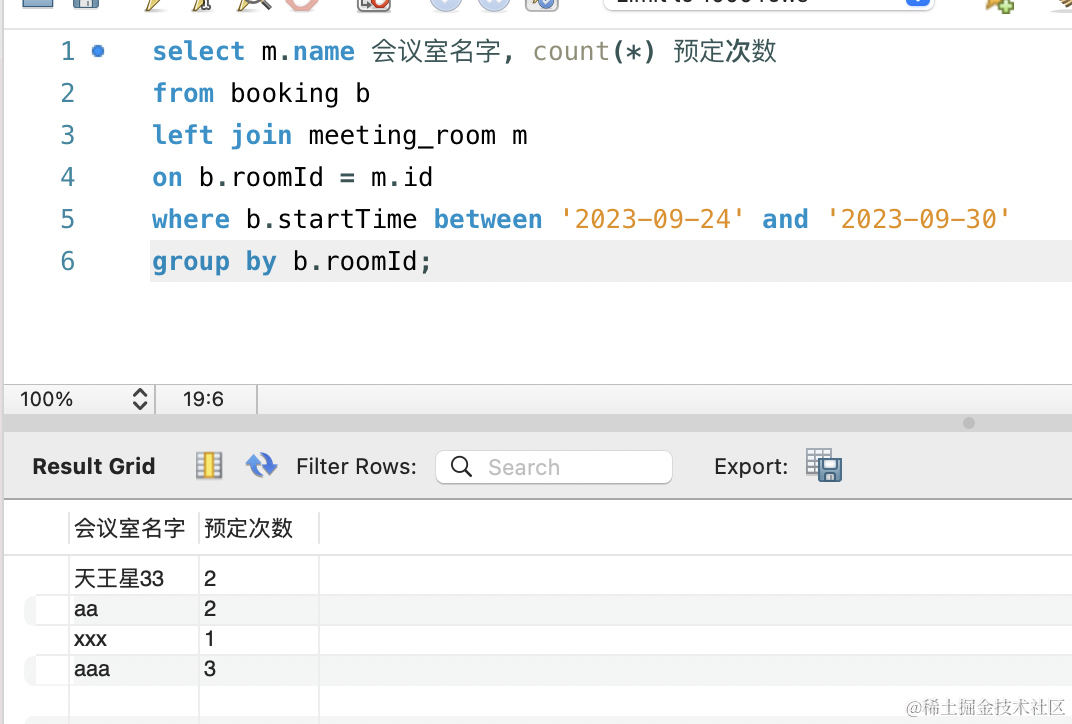 这样查询出来的就是这段时间内每个用户预定了多少次会议室。