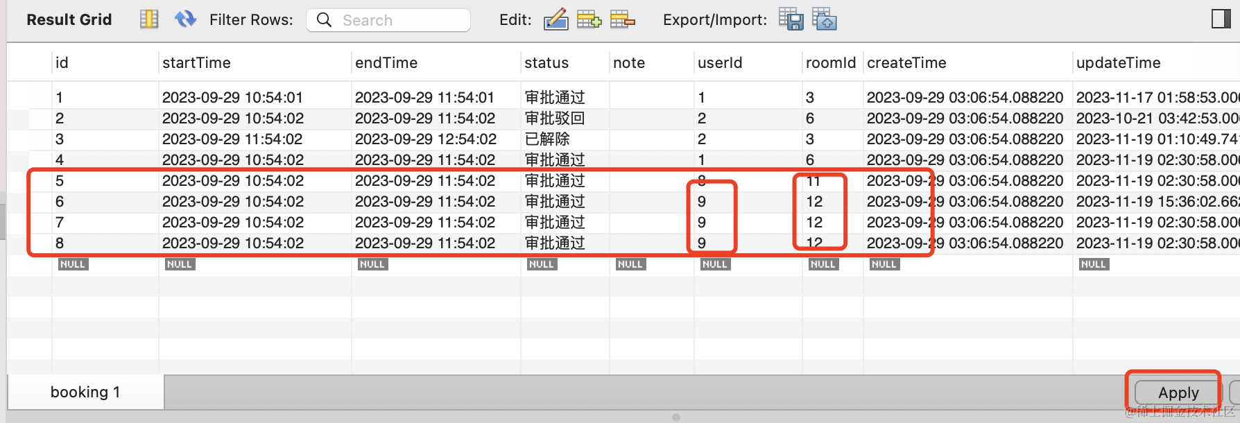 我添加了 4 条数据,并且指定了不同的 userId 和 roomId,点击 apply 应用修改。