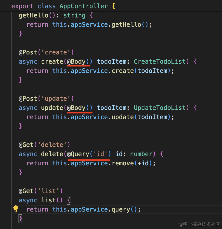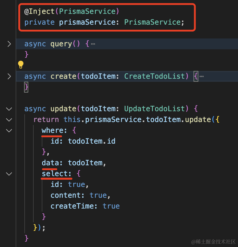 然后在 AppService 里注入 PrismaService,实现 CRUD: