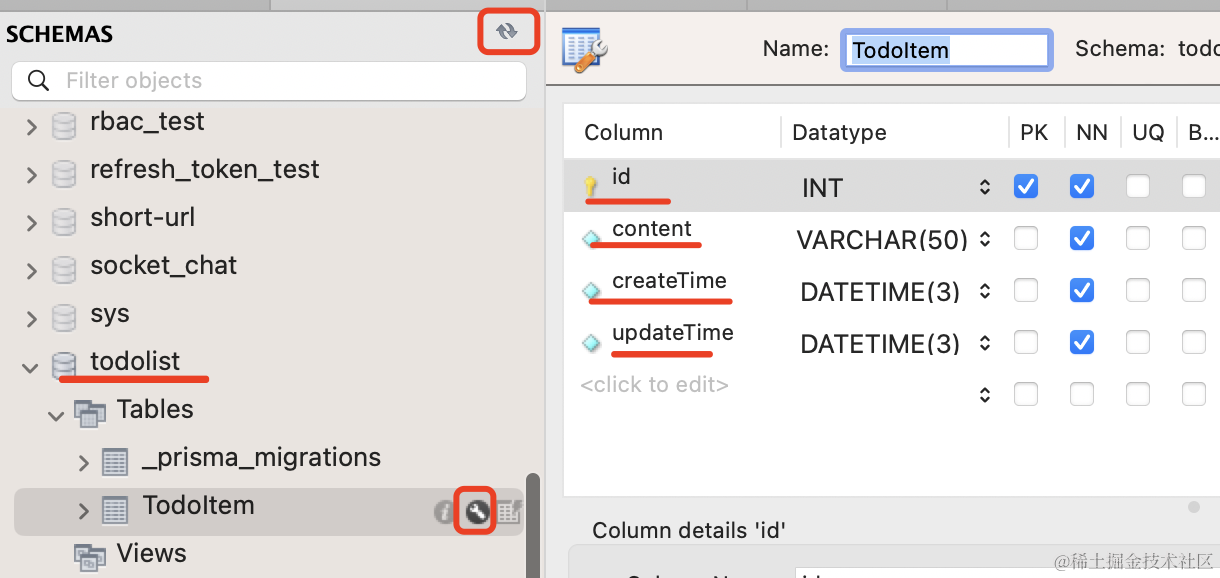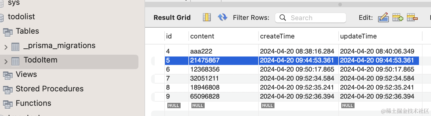 id 自增,content 是长度为 50 的字符串,还有创建时间 createTime、更新时间 updateTime。