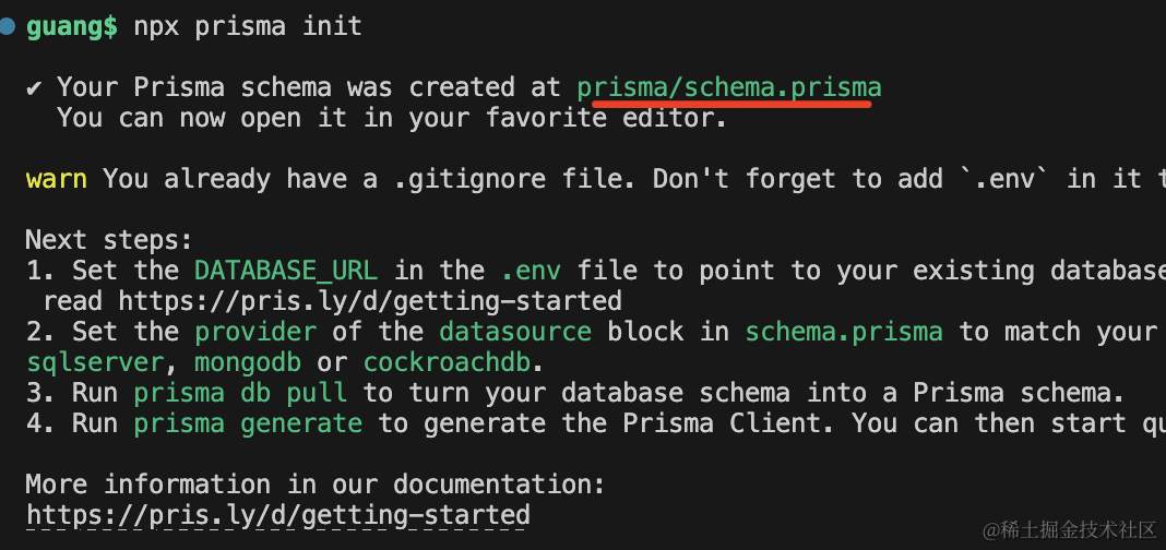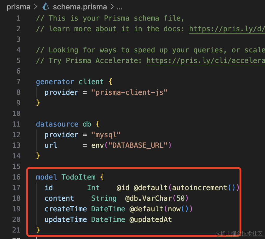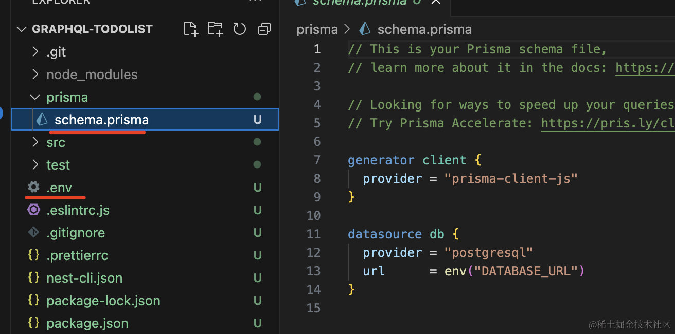 生成了 schema 文件(用来定义 model 的),和 .env 文件: