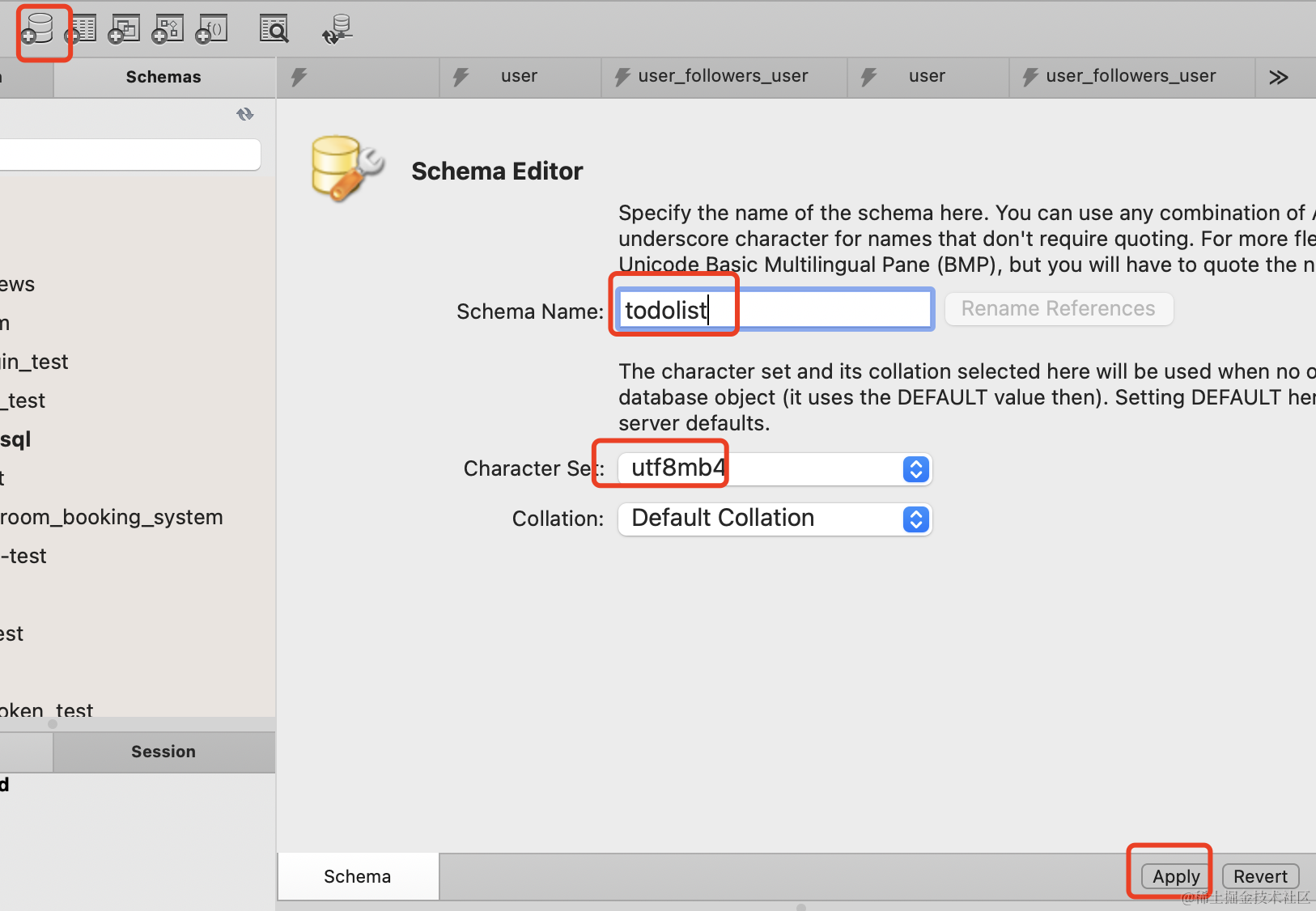指定名字、字符集为 utf8mb4,然后点击右下角的 apply。