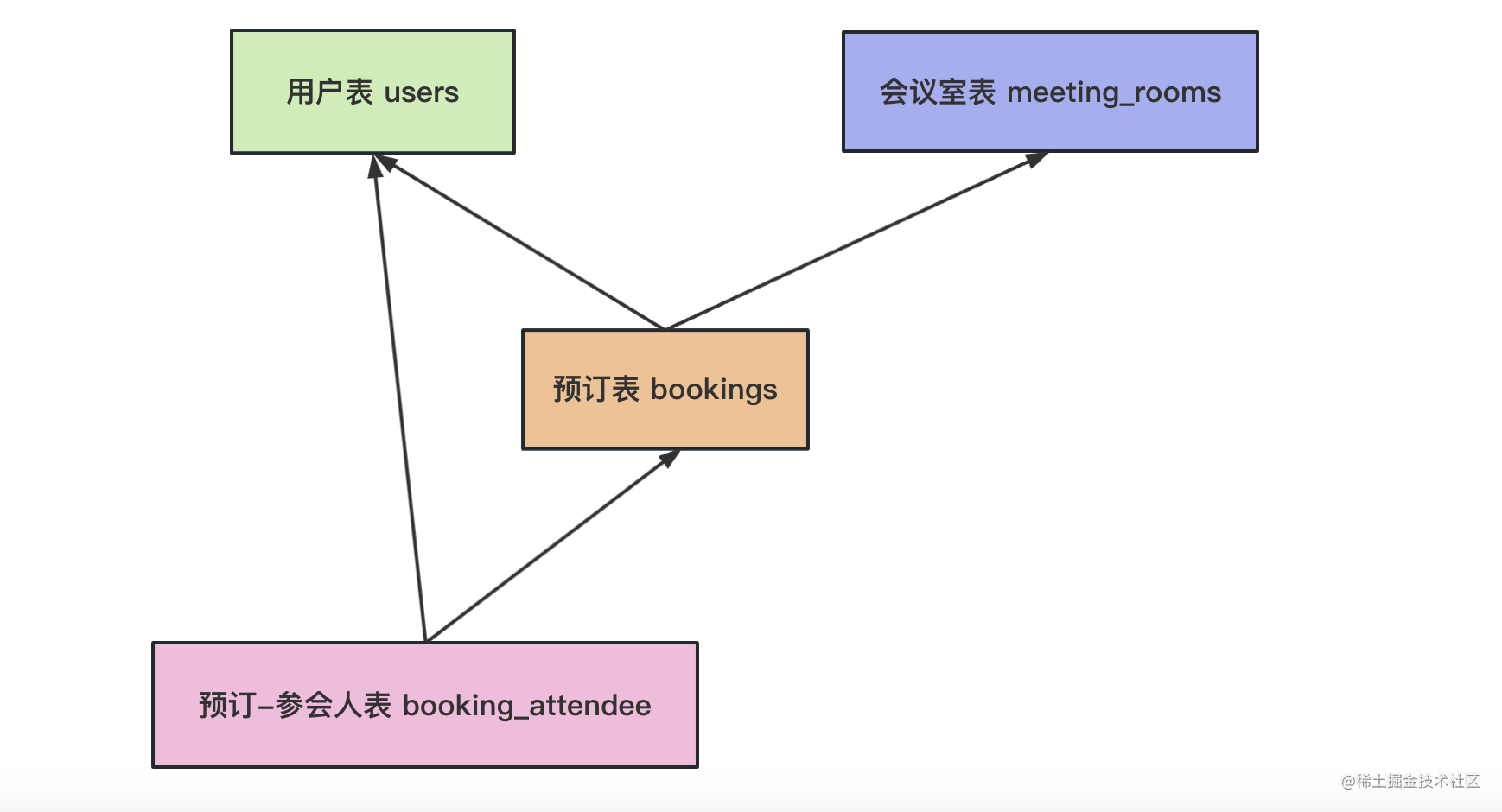 数据库表有 8 个:用户表 users、会议室表 meeting_rooms、预订表 bookings、预订-参会者表 booking_attendees、角色表 roles、权限表 permissions、用户-角色表 user_roles、角色-权限表 role_permissions。