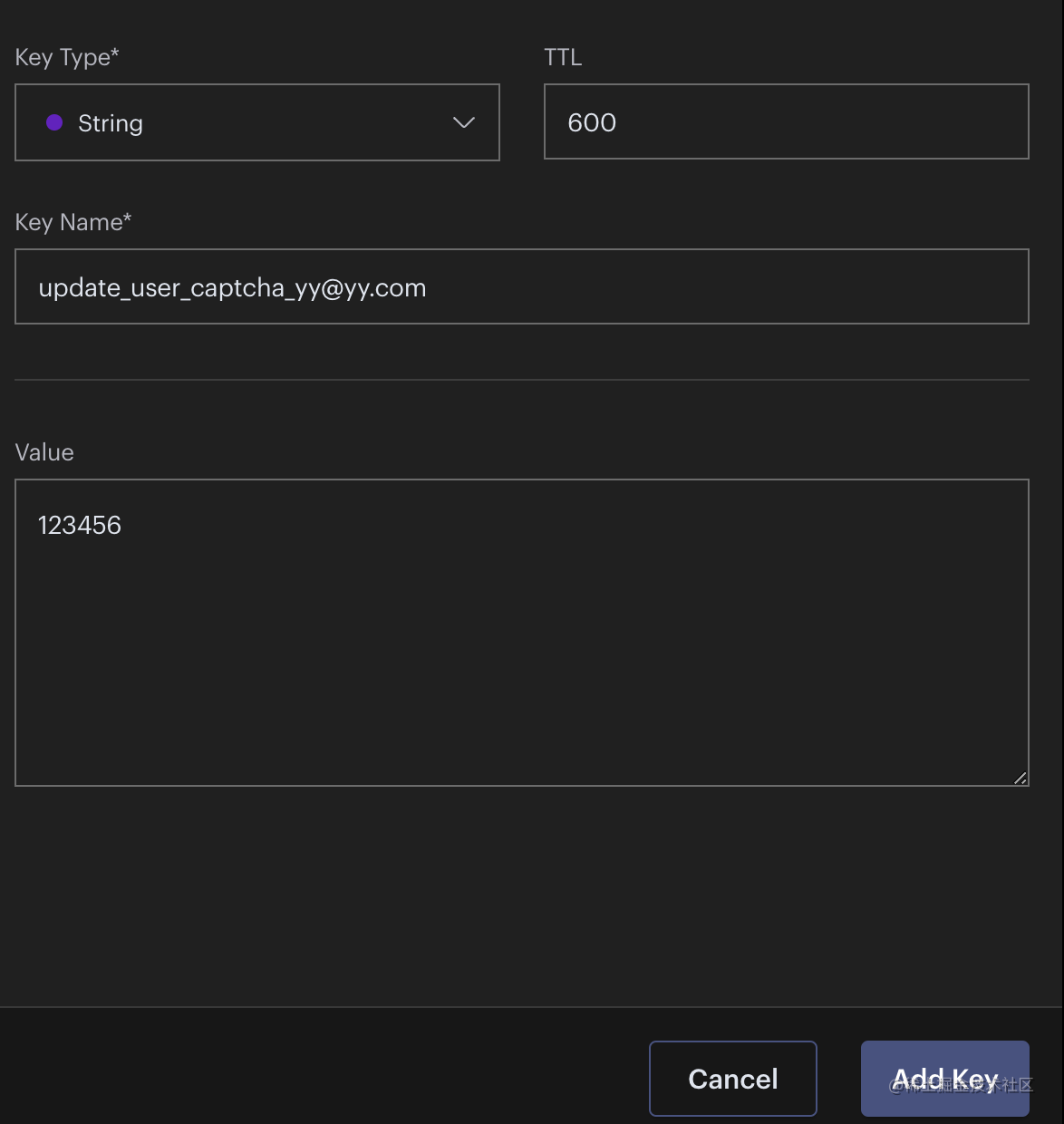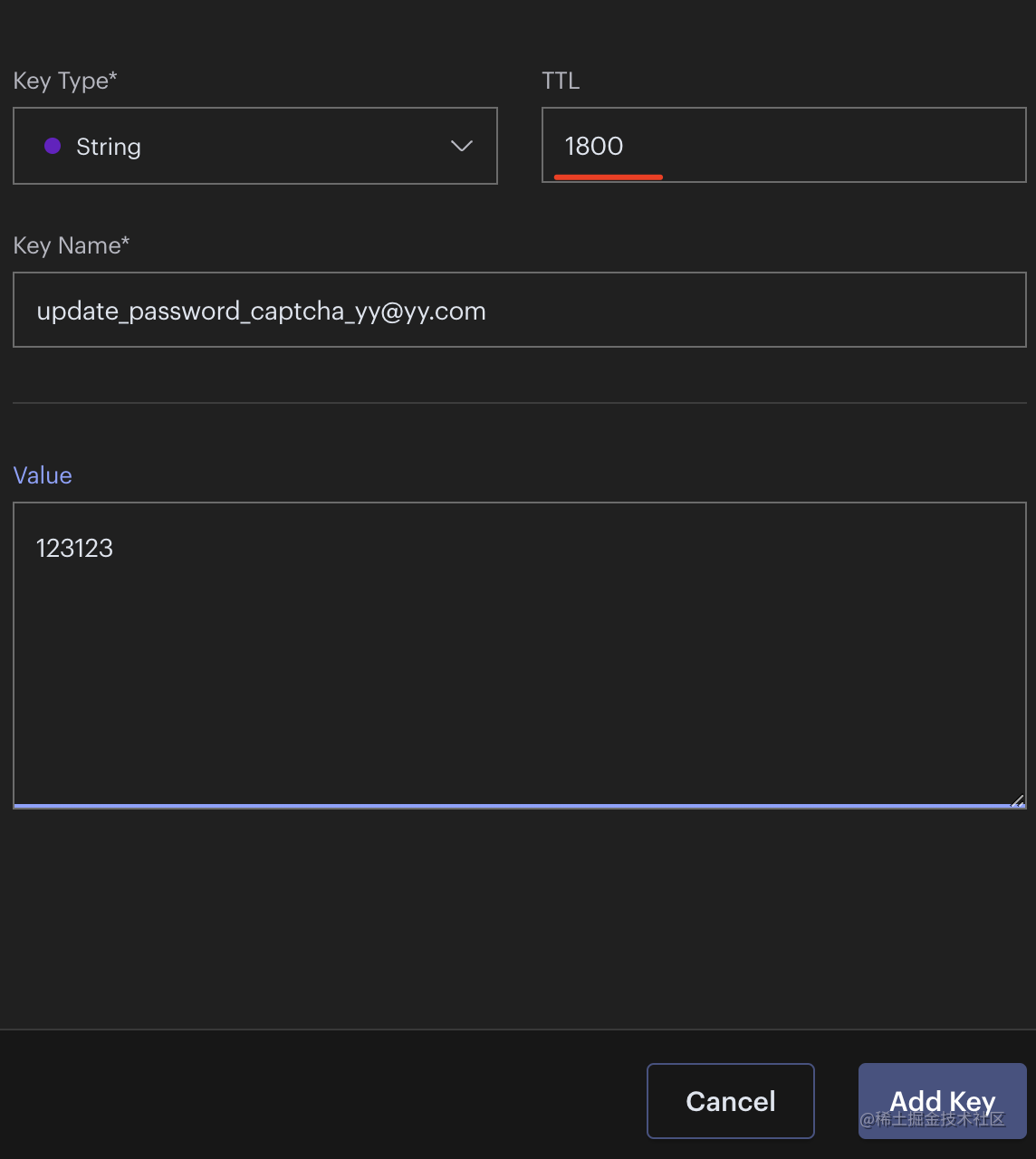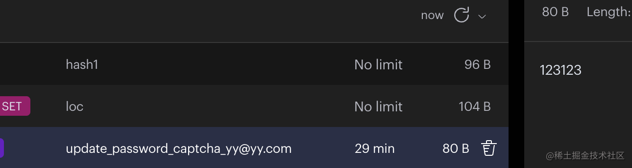 先手动去 redis 里添加 update_password_captcha_yy@yy.com 的 key,值为 123123(注意,我们现在用的是 redis 的 db1)