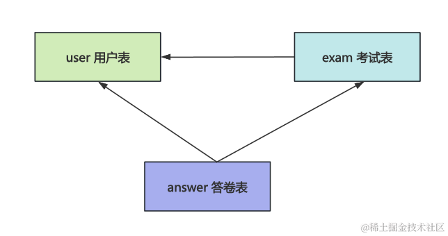 答卷表存储用户的答卷,和考试表是多对一关系,和用户表也是多对一关系。