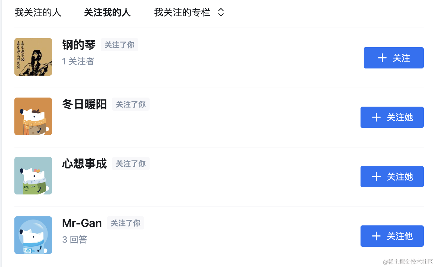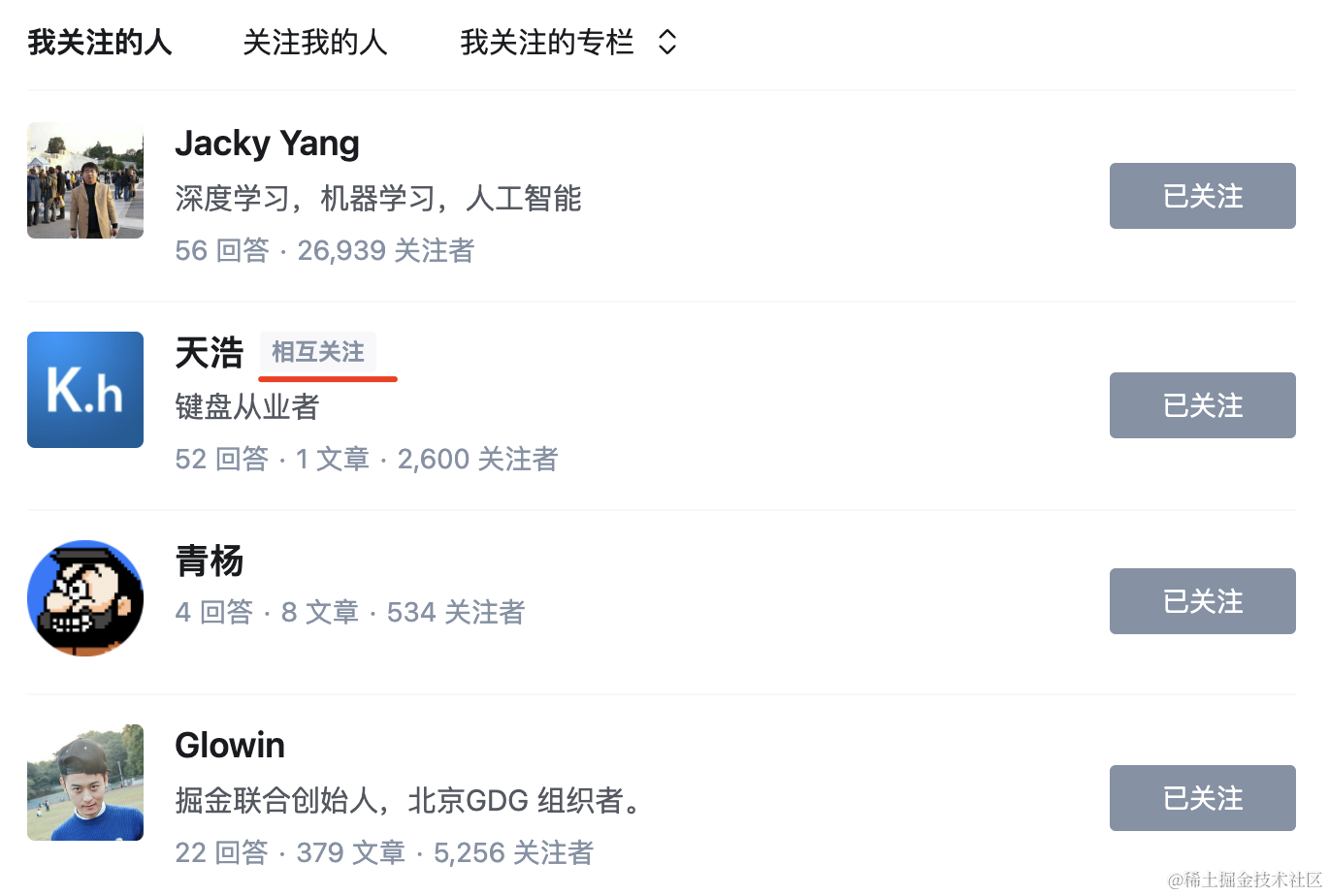 在掘金、知乎、抖音等平台,我们可以关注其他用户,其他用户也可以关注我们,而且如果彼此关注,会标出共同关注: