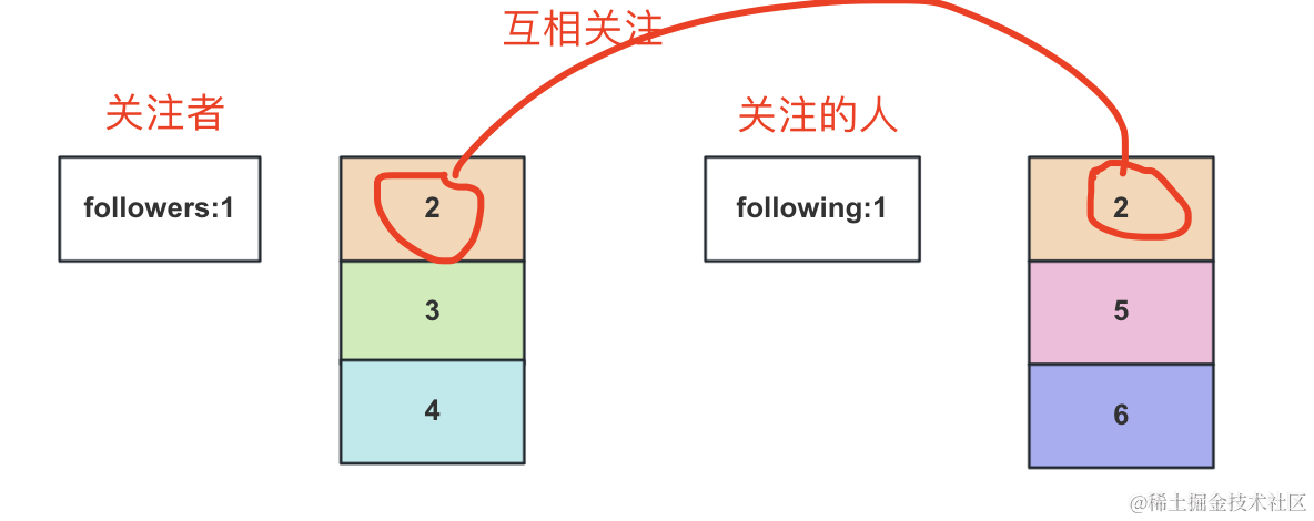 互相关注用 redis 的 Set 来实现,先把 user 的 followers 和 following 存储到集合中。
